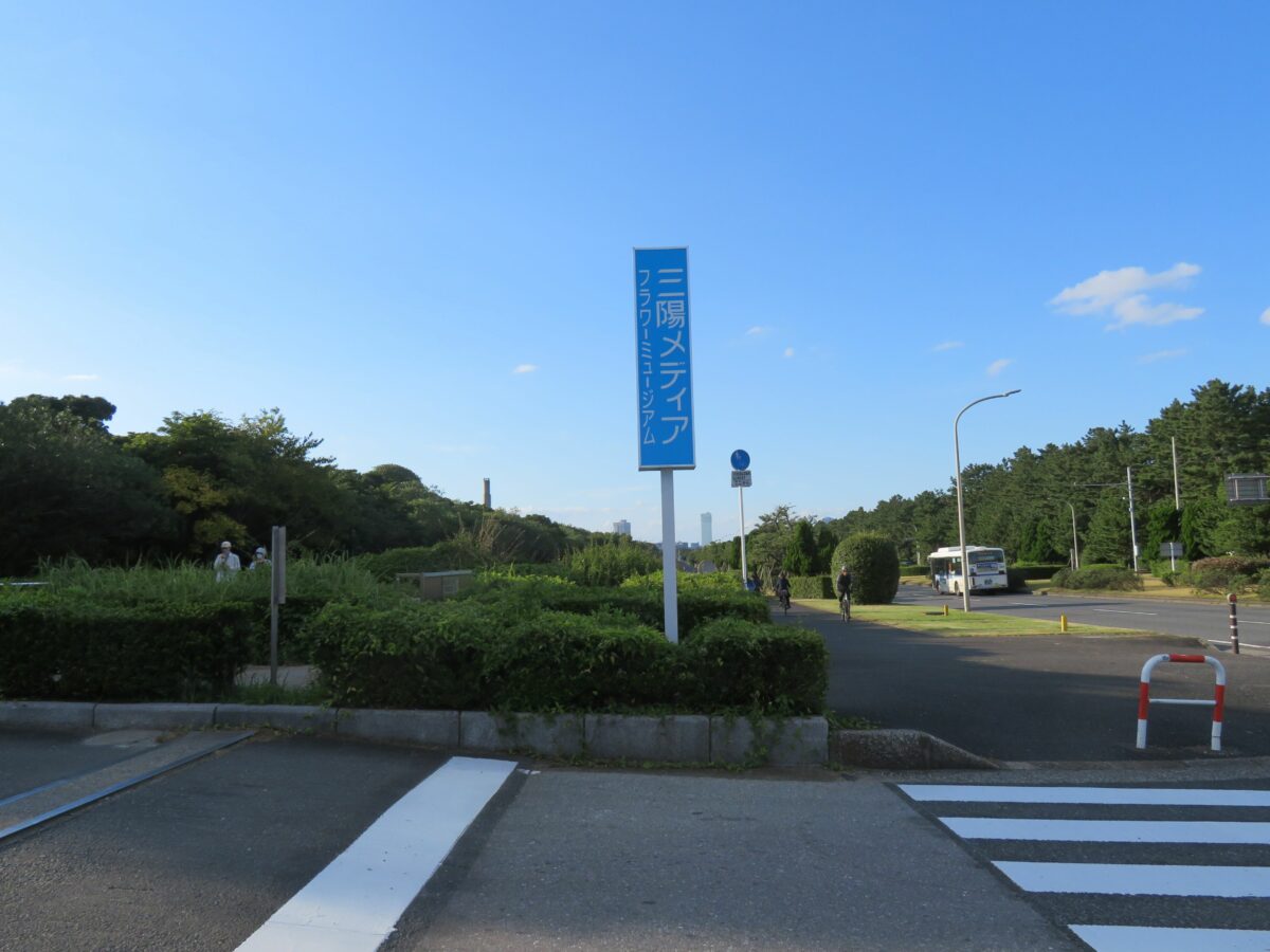 稲毛海浜公園の公園プール入口に立つ三陽メディアフラワーミュージアムの案内板