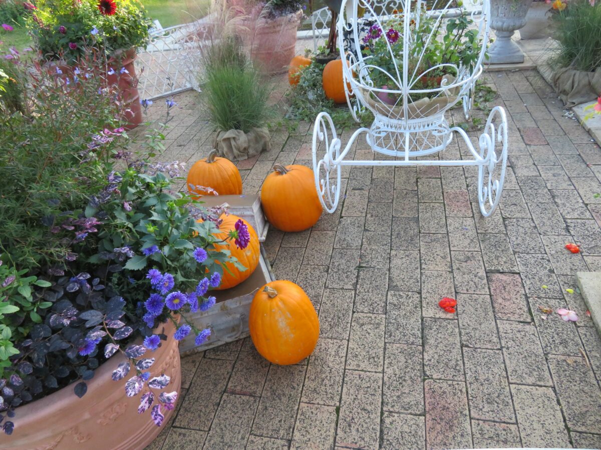 前庭の中央には、大きなカボチャと収穫物を運ぶ荷車が置かれています。