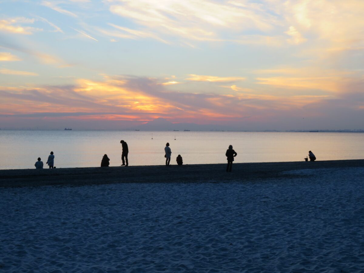 三陽メディアフラワーミュージアムが建つ稲毛海浜公園の浜辺には、夕方になると数多くの人が波打ち際に並びます。東京湾越しに浮かぶ富士山をかすめて夕陽が沈んでいくのです。
