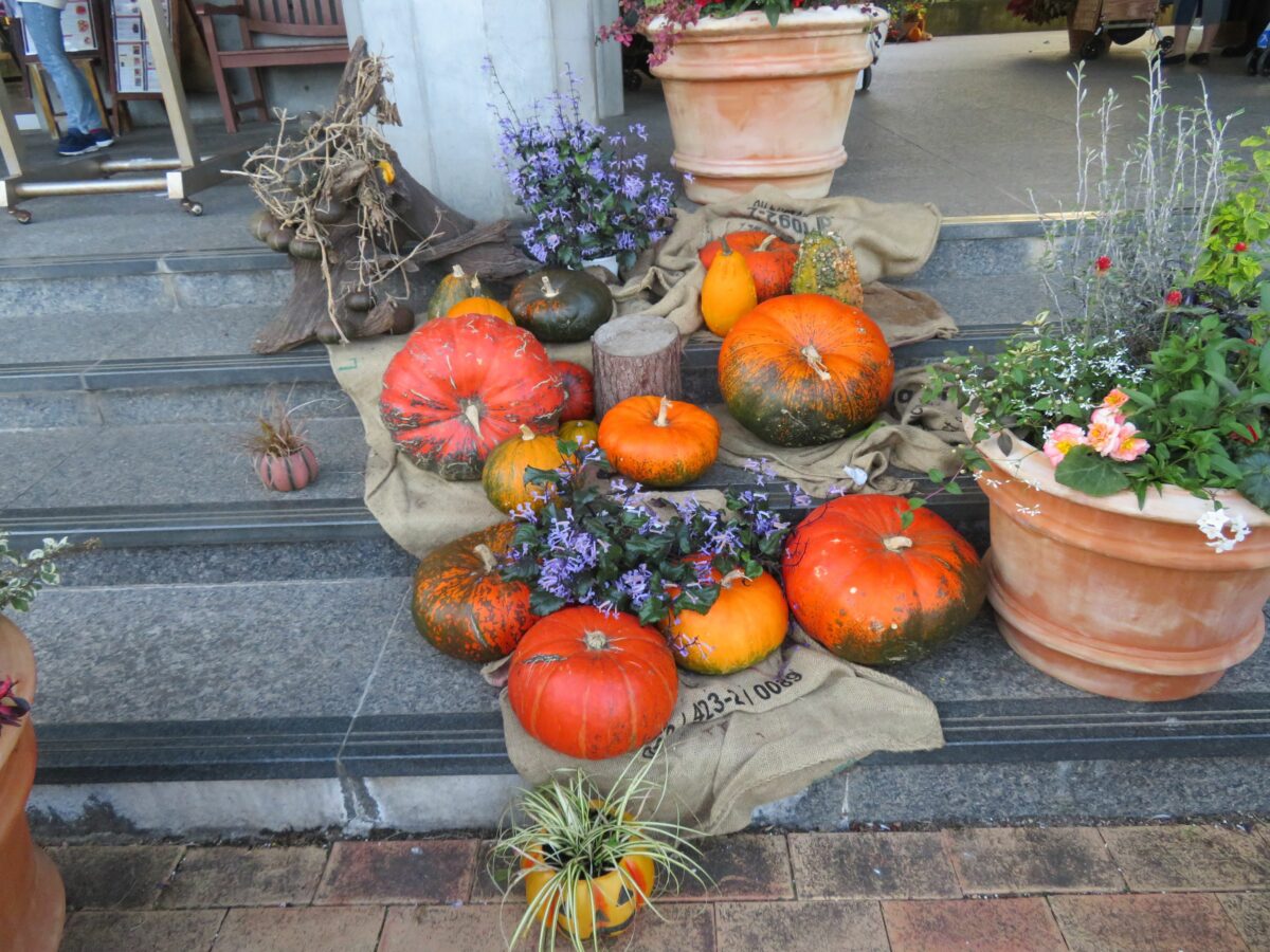 前庭から展示棟の玄関に向かう数段の階段に置かれたカボチャ