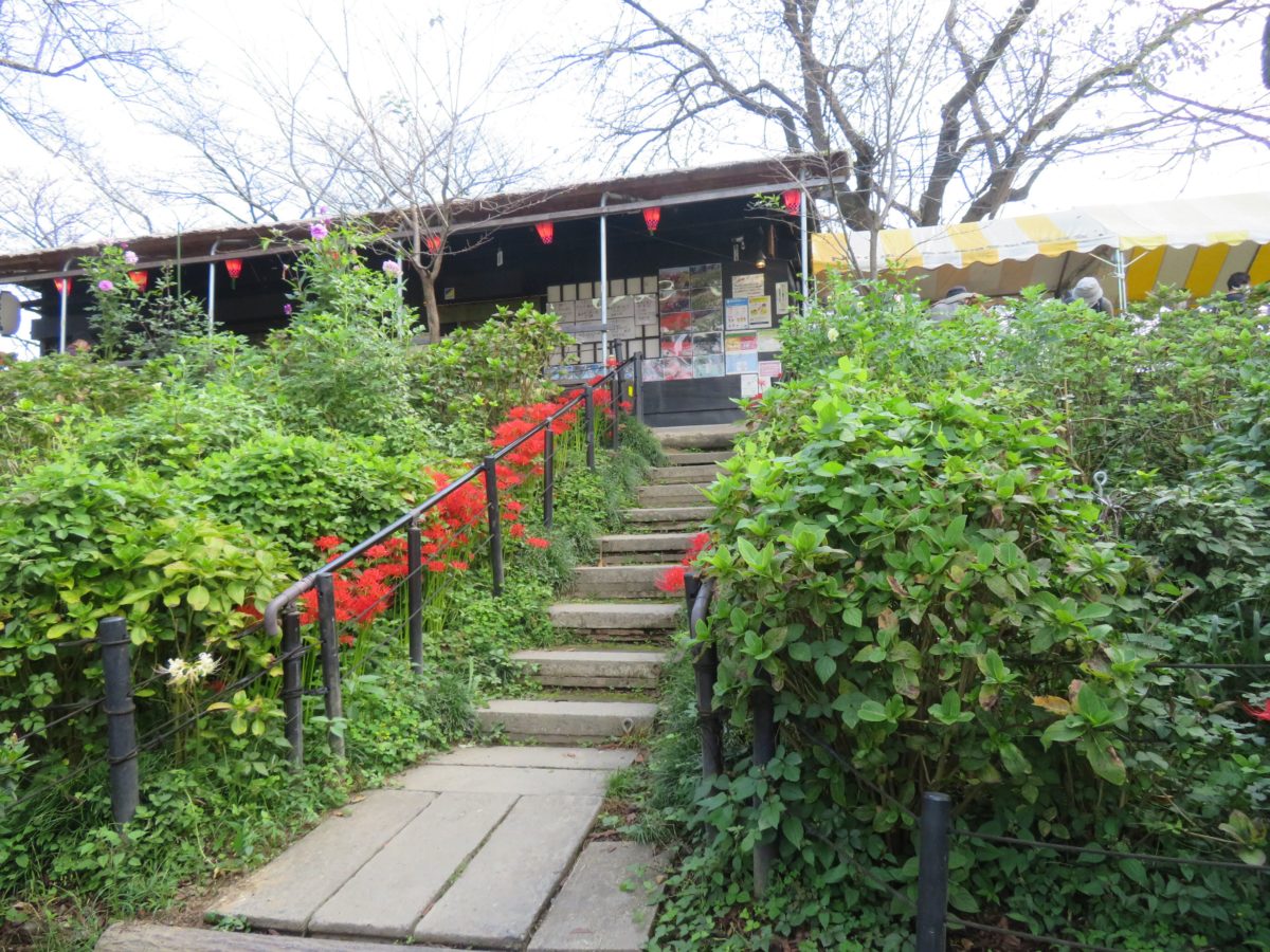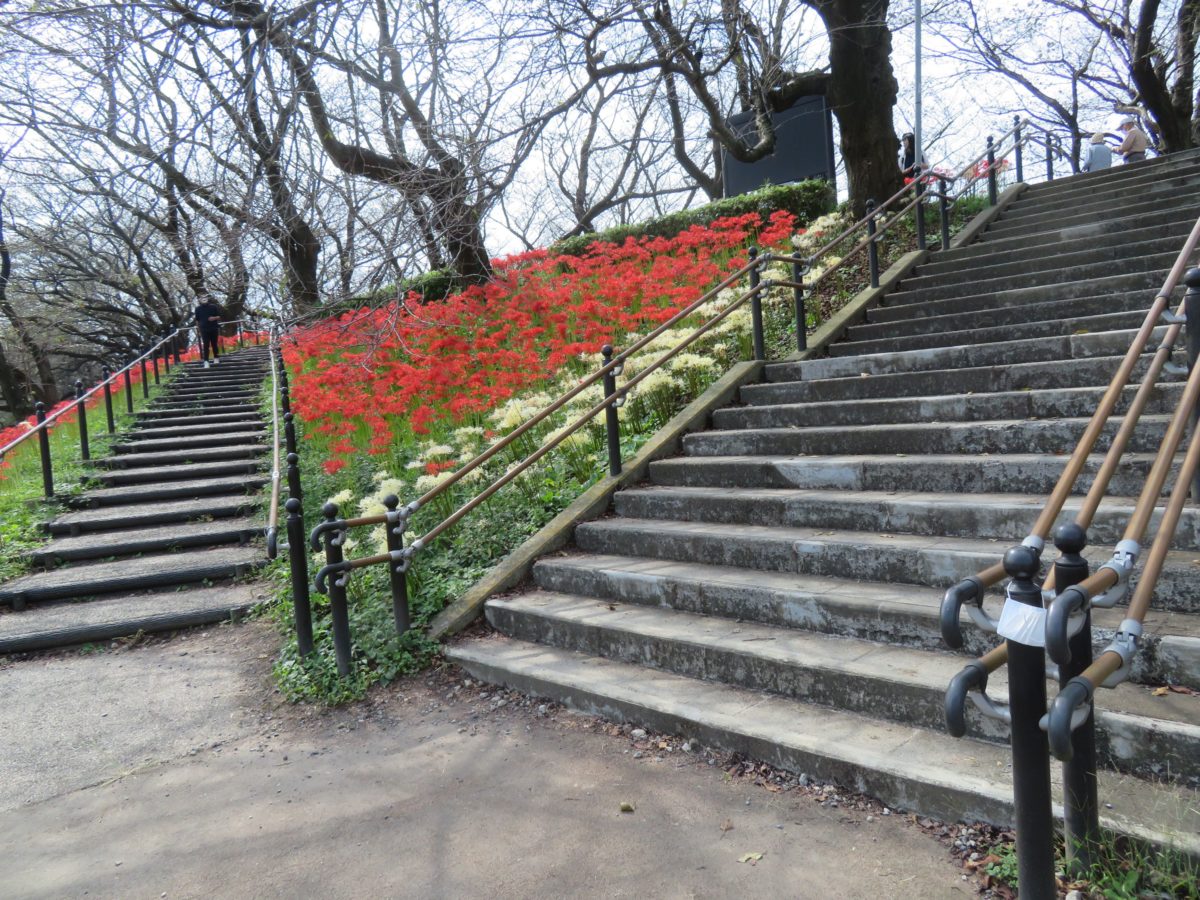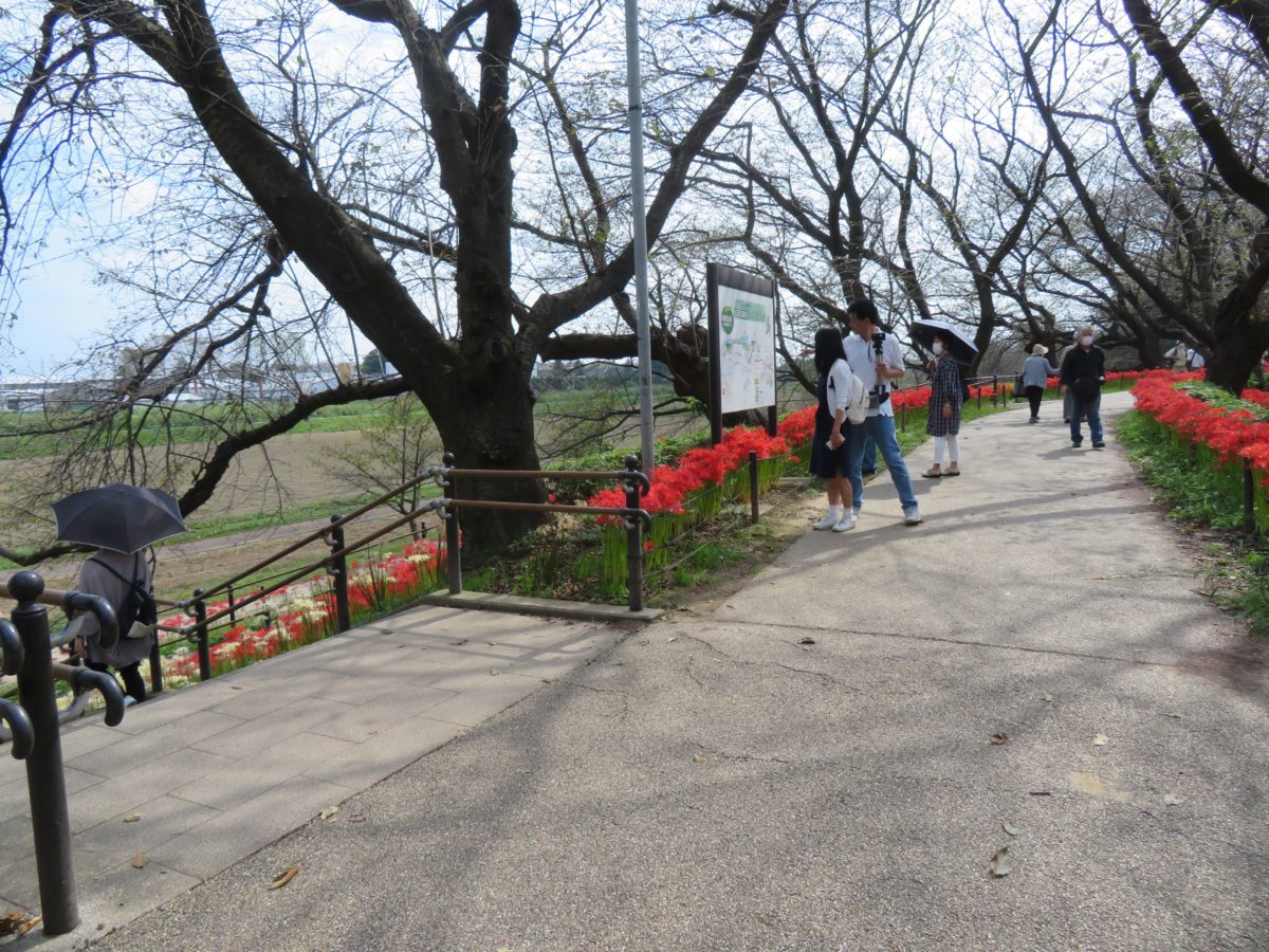 堤防の斜面には川側にも市街地側にも数か所、階段が設けられているので、真赤な絨毯を様々な角度から眺めることができます。