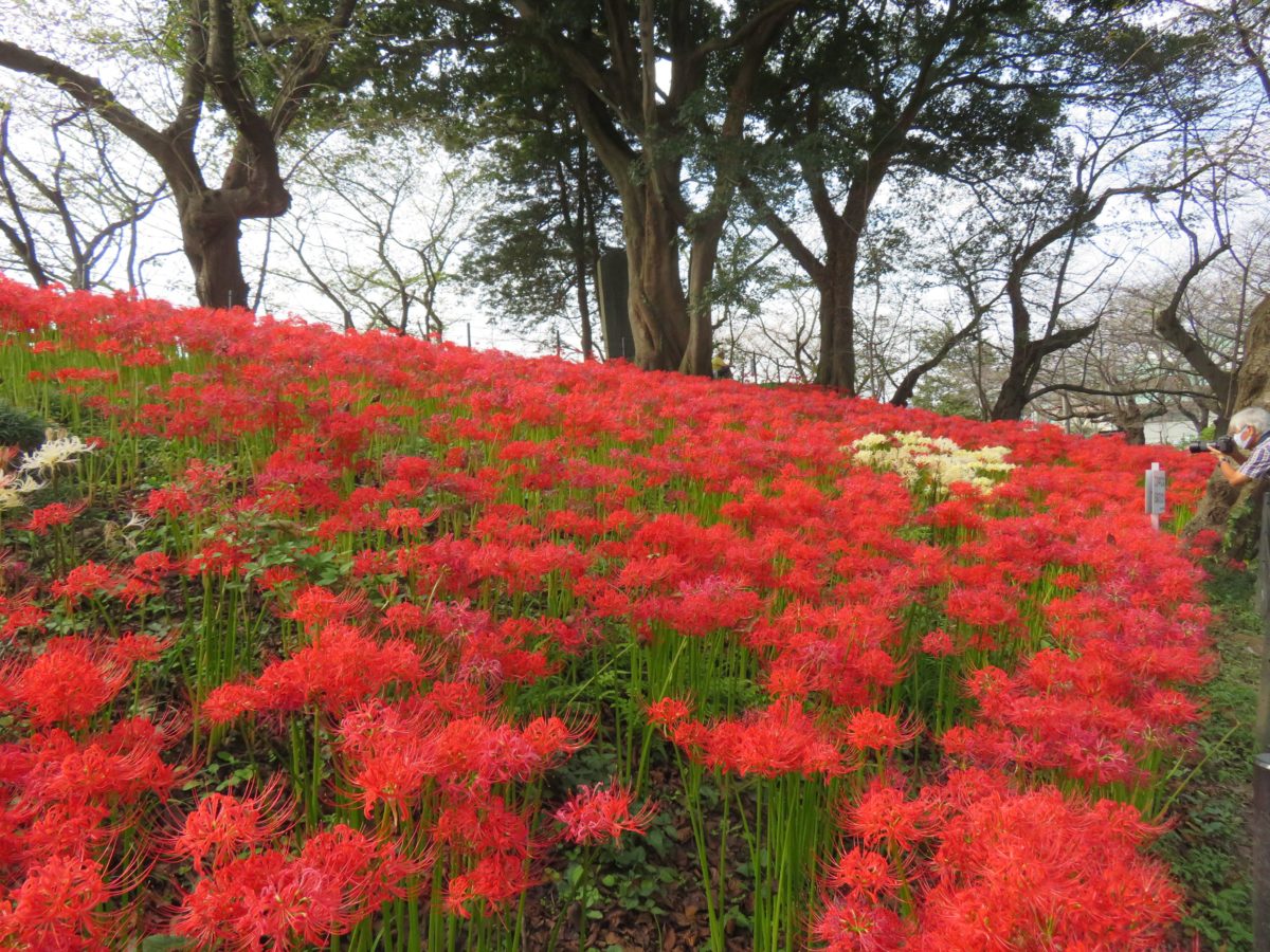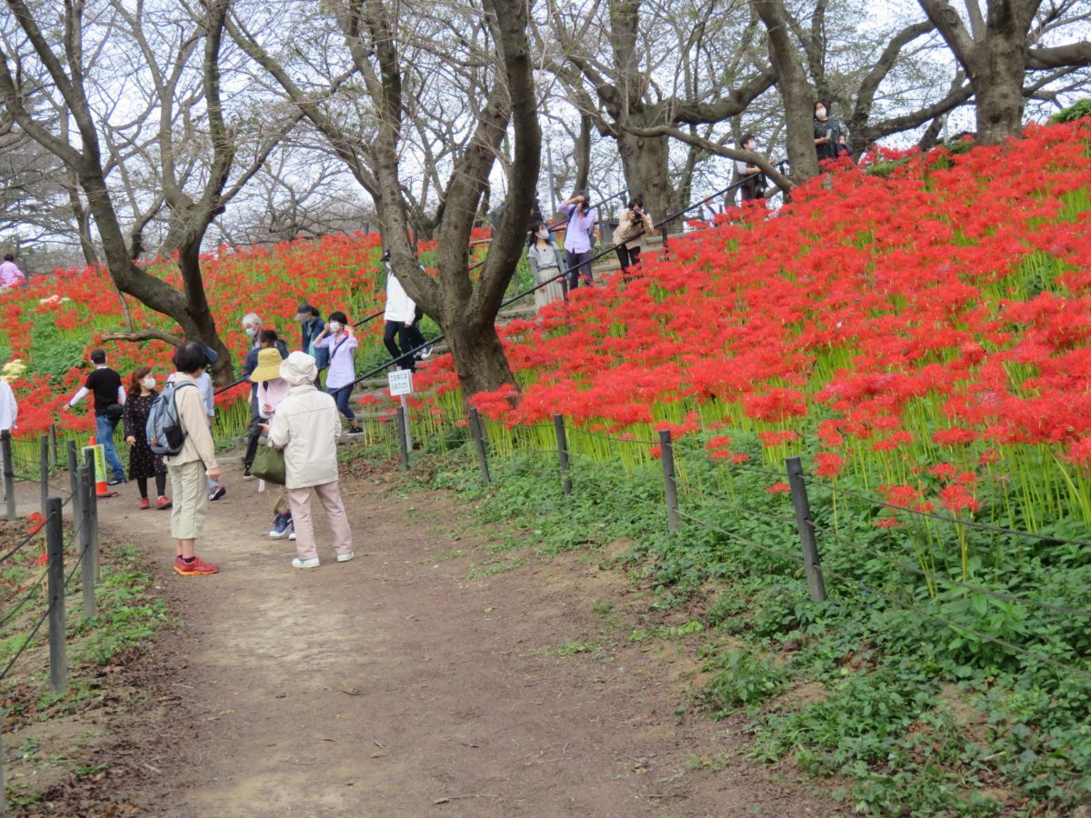 土手道に一列に並ぶ花には規律正しさも感じられるものですが、左右の斜面も隙間なく曼殊沙華の花が埋め尽くします。園内には約500万本もの曼殊沙華が一斉に花を咲かせるのです。見渡す限りを真赤に染まる景観は、まるで絨毯を敷き詰めたようです。