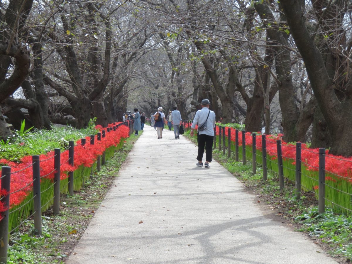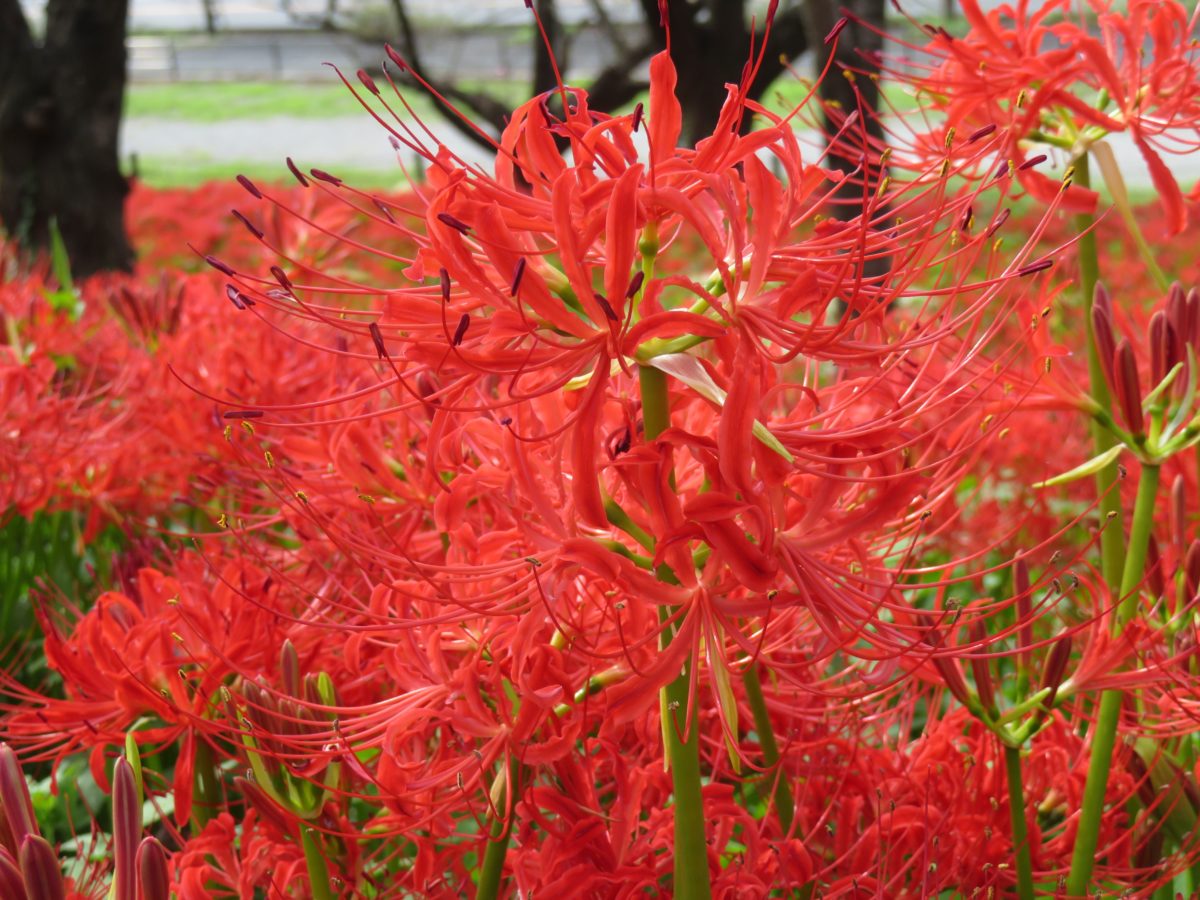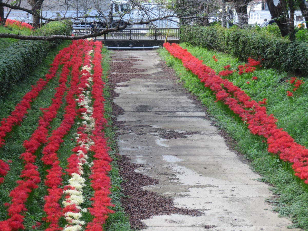 権現堂公園には2000年から市民ボランティアが、曼殊沙華を育てるようになりました。土手道の左右は、端から端まで曼殊沙華の花のラインが繋がります。足元に咲く曼殊沙華の花には愛らしさが満ち溢れます。