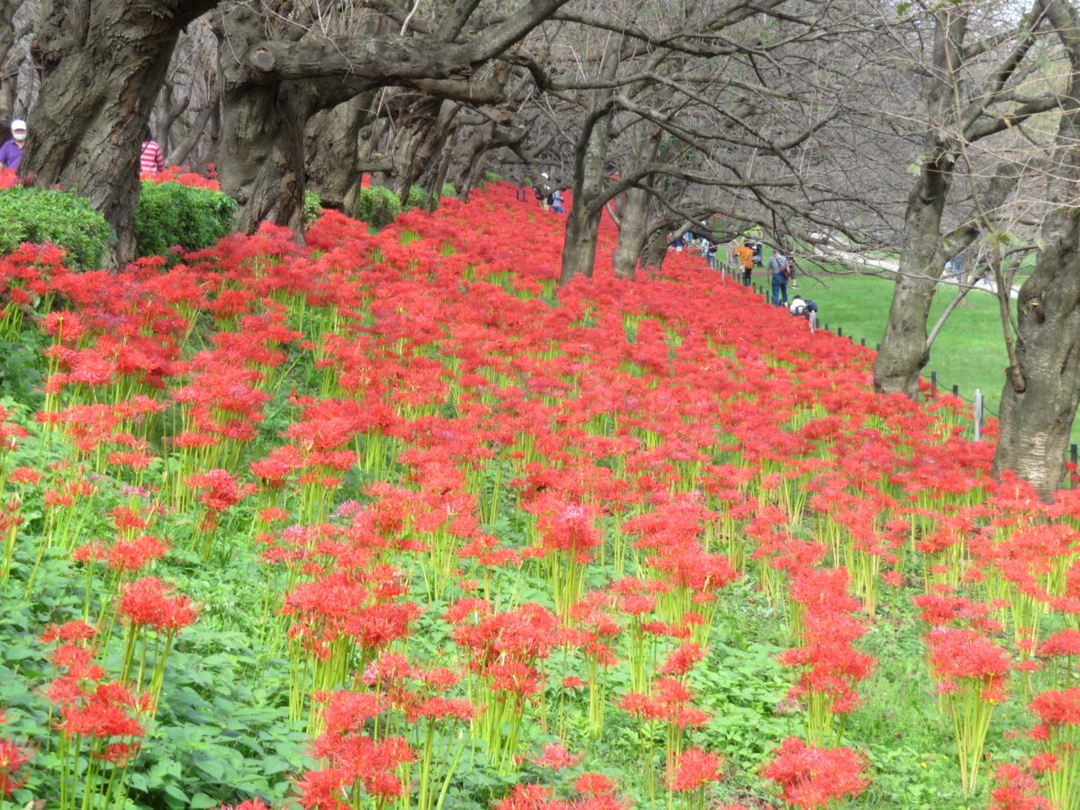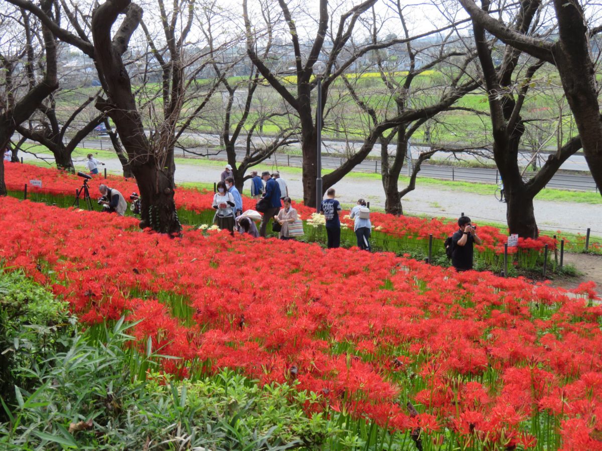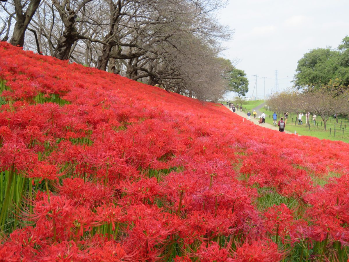 埼玉県幸手市の北部を流れる中川沿いの権現堂公園は、例年9月中旬から10月上旬にかけて真赤な花で覆われます。約1キロの堤防が約500万本の曼殊沙華で隙間なく彩られるのです。