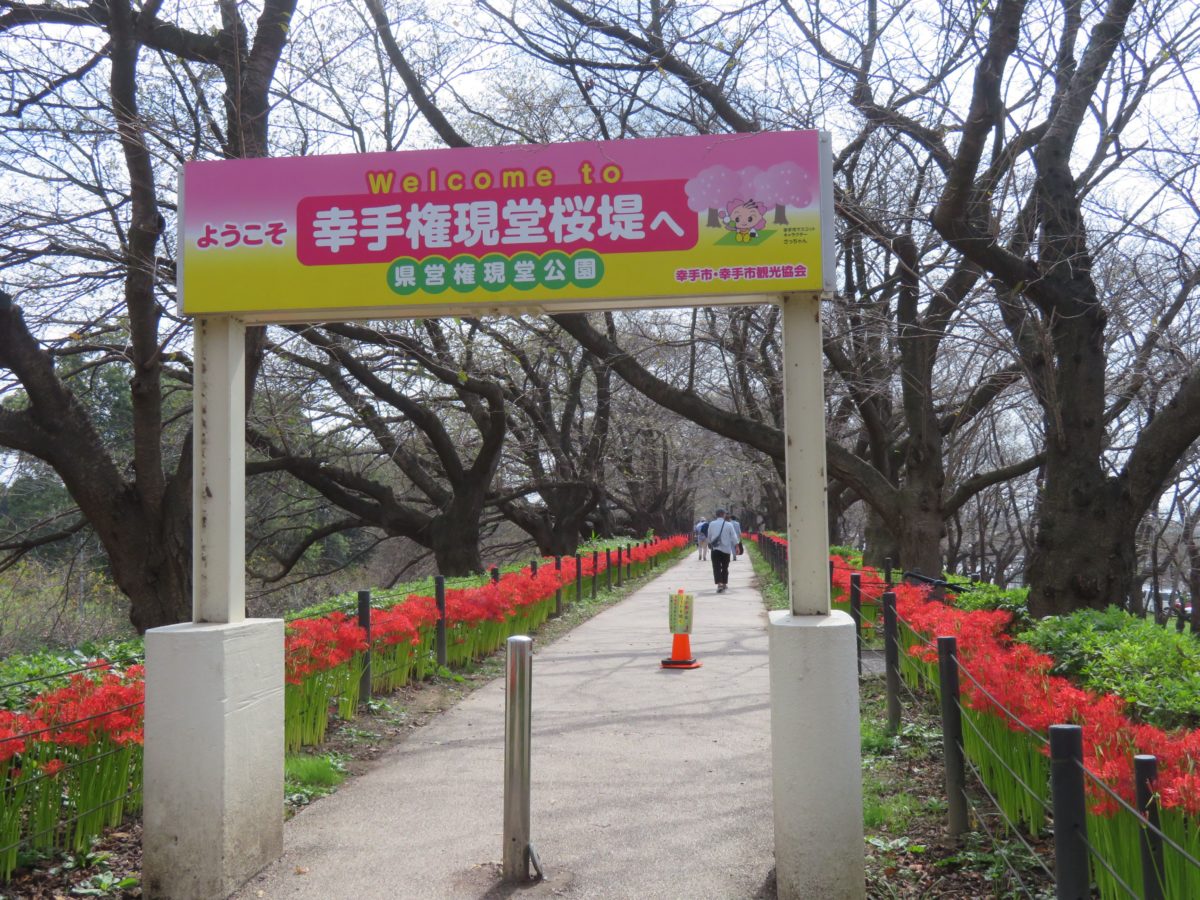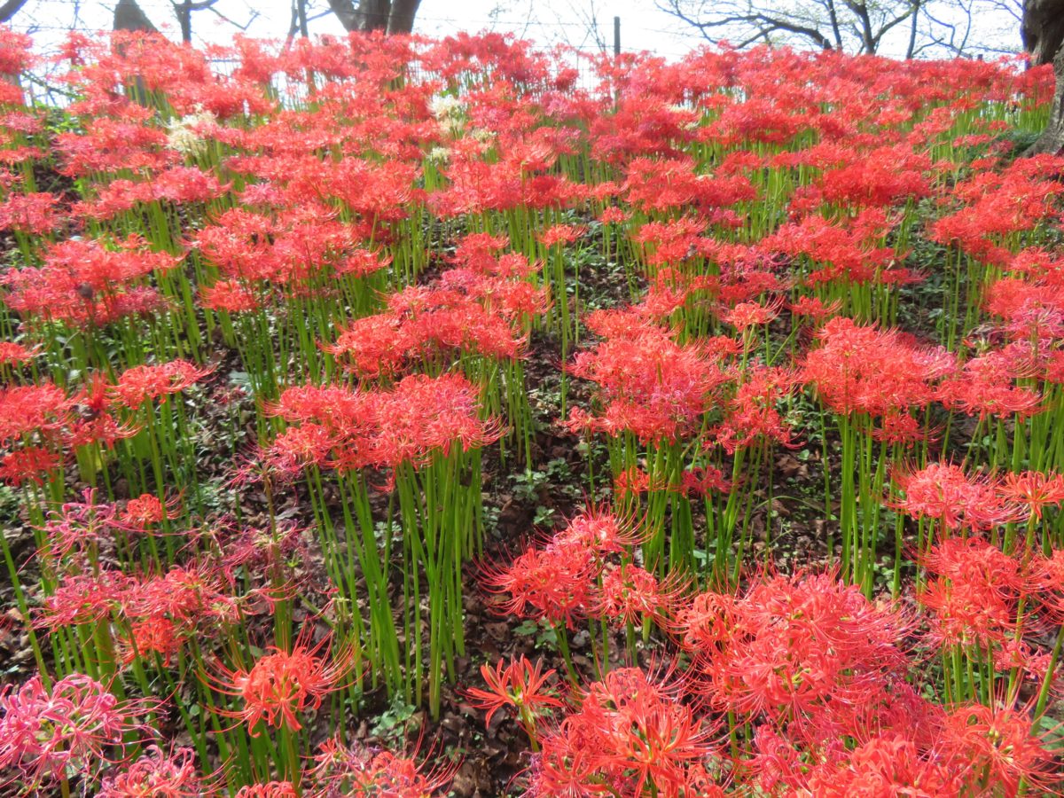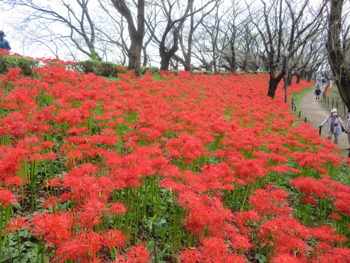 埼玉県幸手市の北部を流れる中川沿いの権現堂公園は、例年9月中旬から10月上旬にかけて真赤な花で覆われます。約1キロの堤防が約500万本の曼殊沙華で隙間なく彩られるのです。