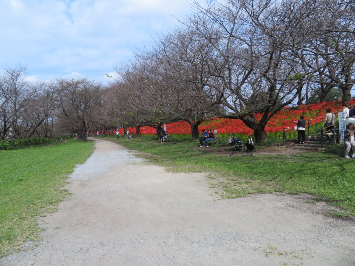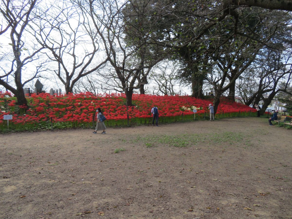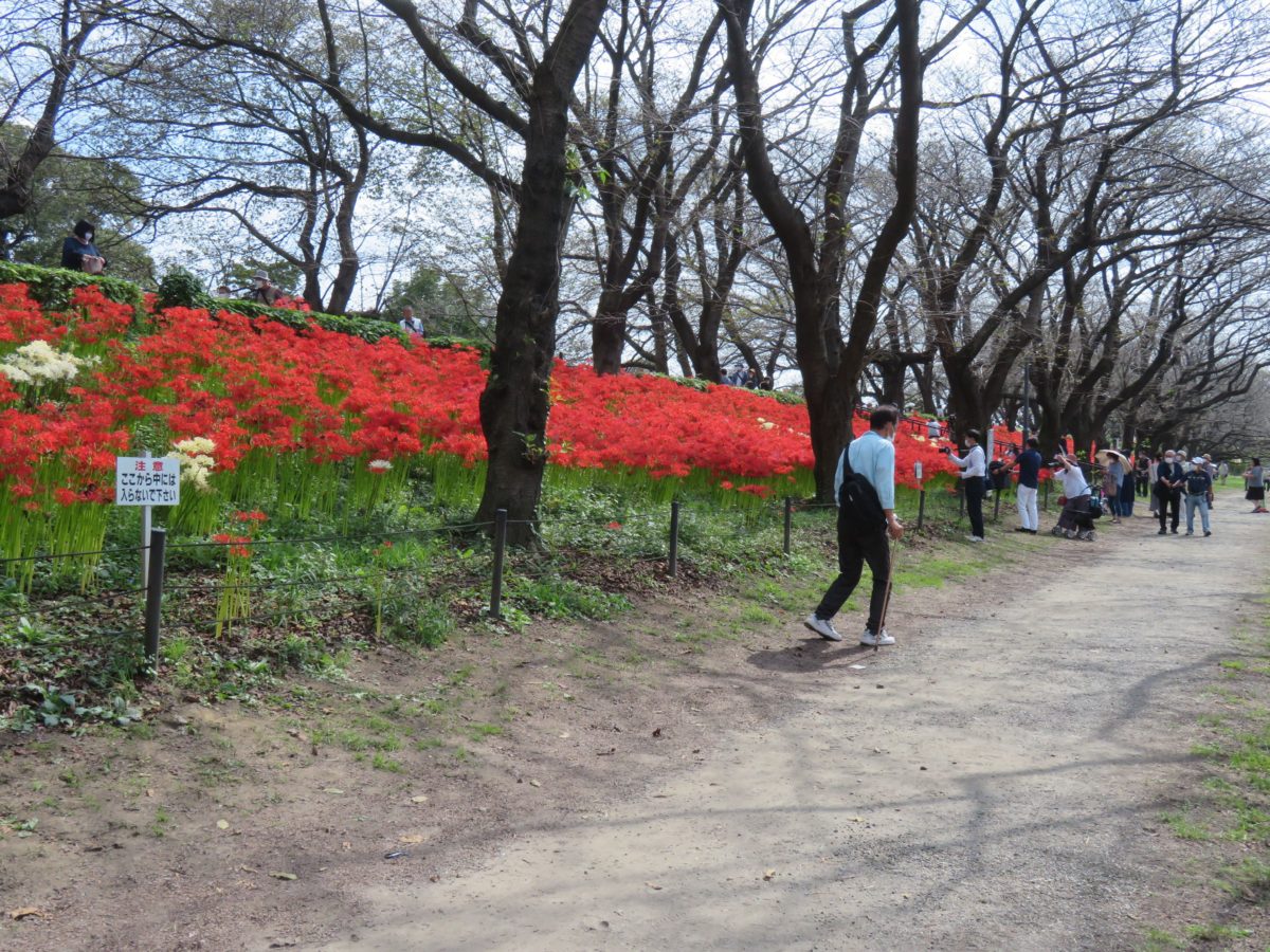 権現堂公園には川沿いに約1キロの堤防が作られています。その中央部は幅が広く小さな公園のようです。この公園からは360度のパノラマで真赤な花が取り囲みます。土手下の水路の両側も曼殊沙華が平行に整列しています。