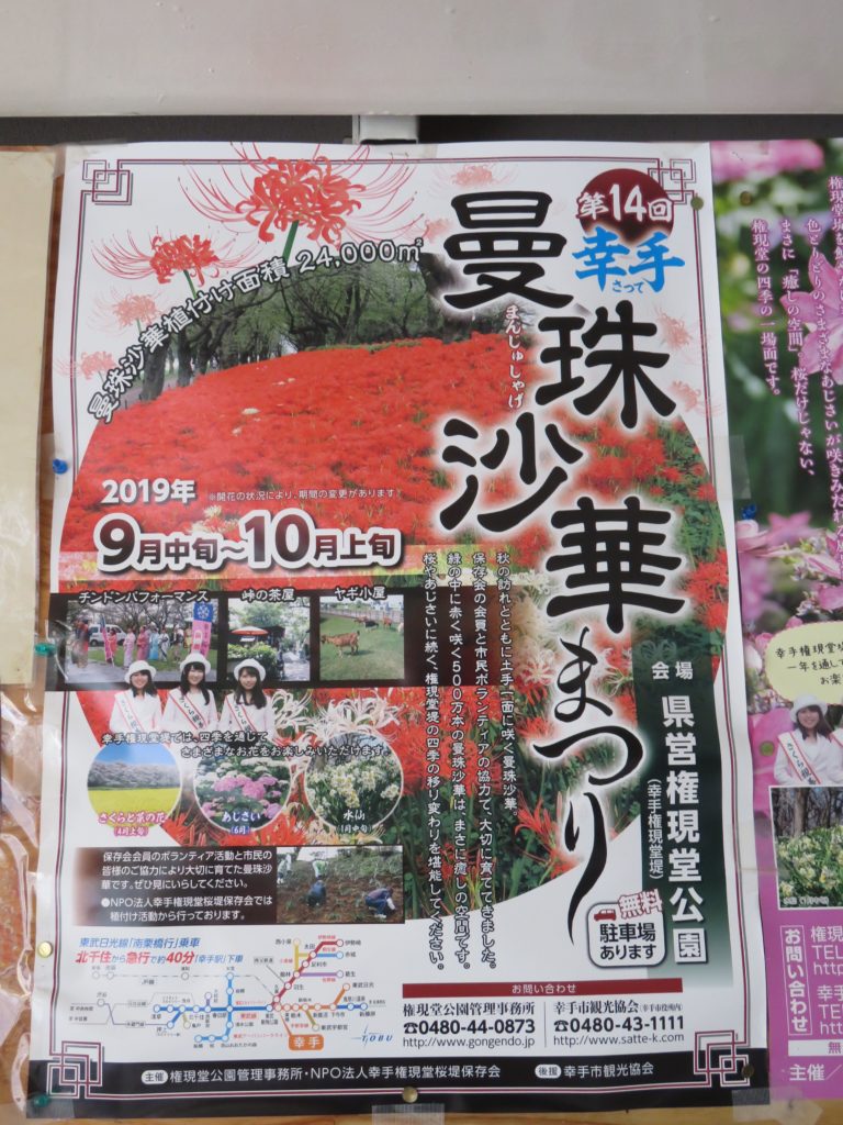 埼玉県幸手市の北部を流れる中川沿いに、権現堂公園が整備されています。堤防は一年を通じて季節の花で彩られます。権現堂公園で夏の暑さが和らぎ涼しい風とともに姿を現すのが、彼岸花とも呼ばれる曼殊沙華です。駐車場で車を降りると同時に、真赤に染まる土手の姿が目に飛び込んできます。