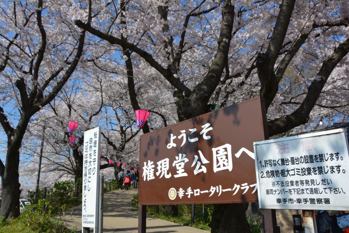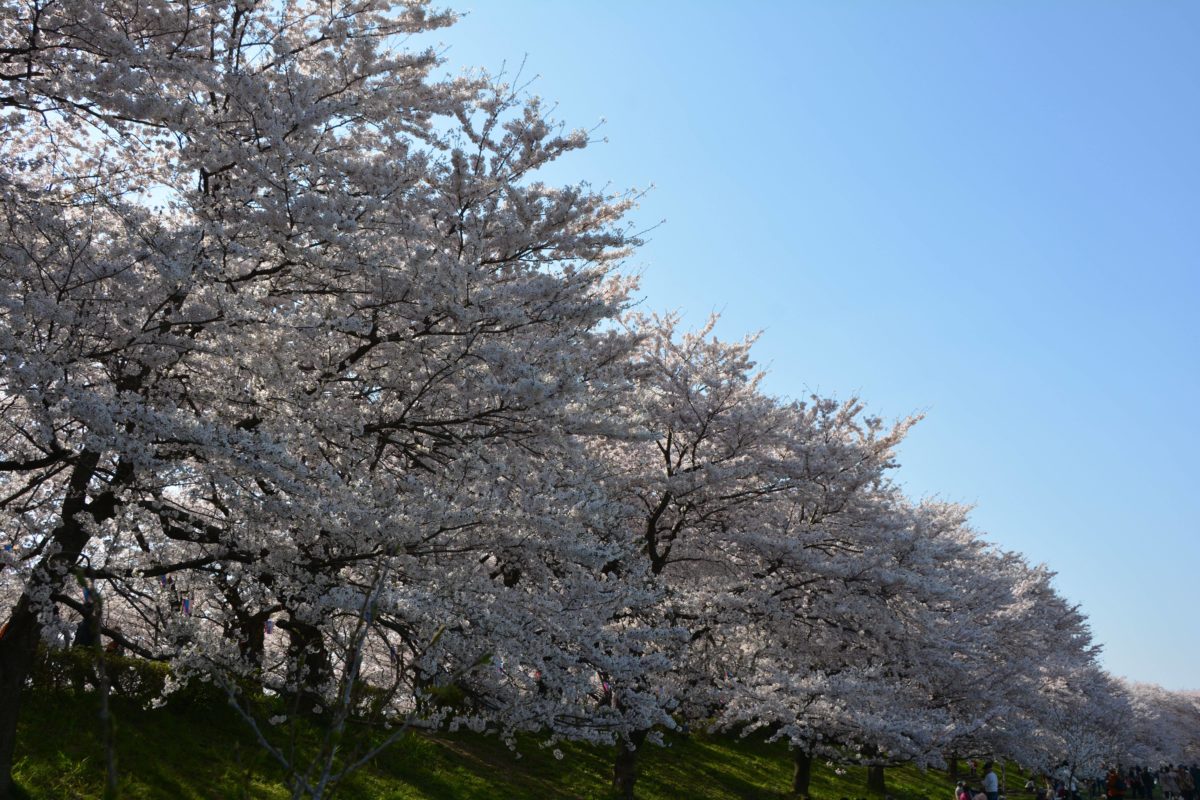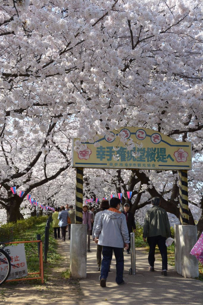 幸手市の権現堂地区は、古くから中川と権現堂川による水害に悩まされていました。1576年頃から2つの川に沿って堤防が築かれ始めましたが、決壊と修復が幾度も繰り返されたようです。1920年頃からは中川の土手に桜の植樹を行い、堤防の強化が図られました。数年後には約1キロの権現堂桜堤が完成し、3月下旬から4月上旬にかけて薄紅色の花をつけるようになったのです。桜堤ではソメイヨシノを中心に約1000本の桜が並木を作っています。遊歩道の頭上には桜の花が隙間なく重なり合い、まるで桜のトンネルです。桜堤は薄紅色一色に化粧し、春の訪れを体感することができます。