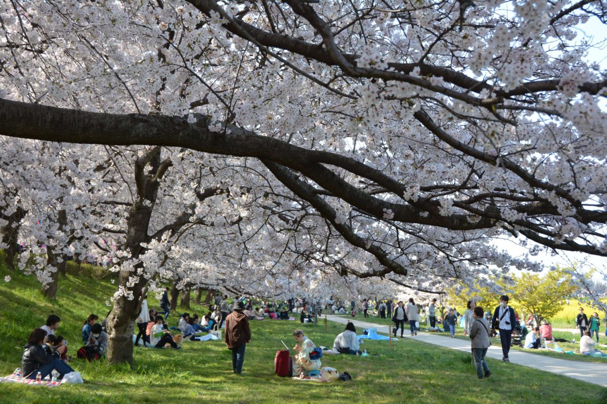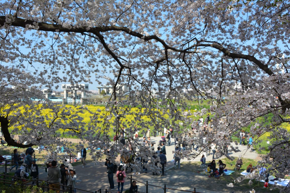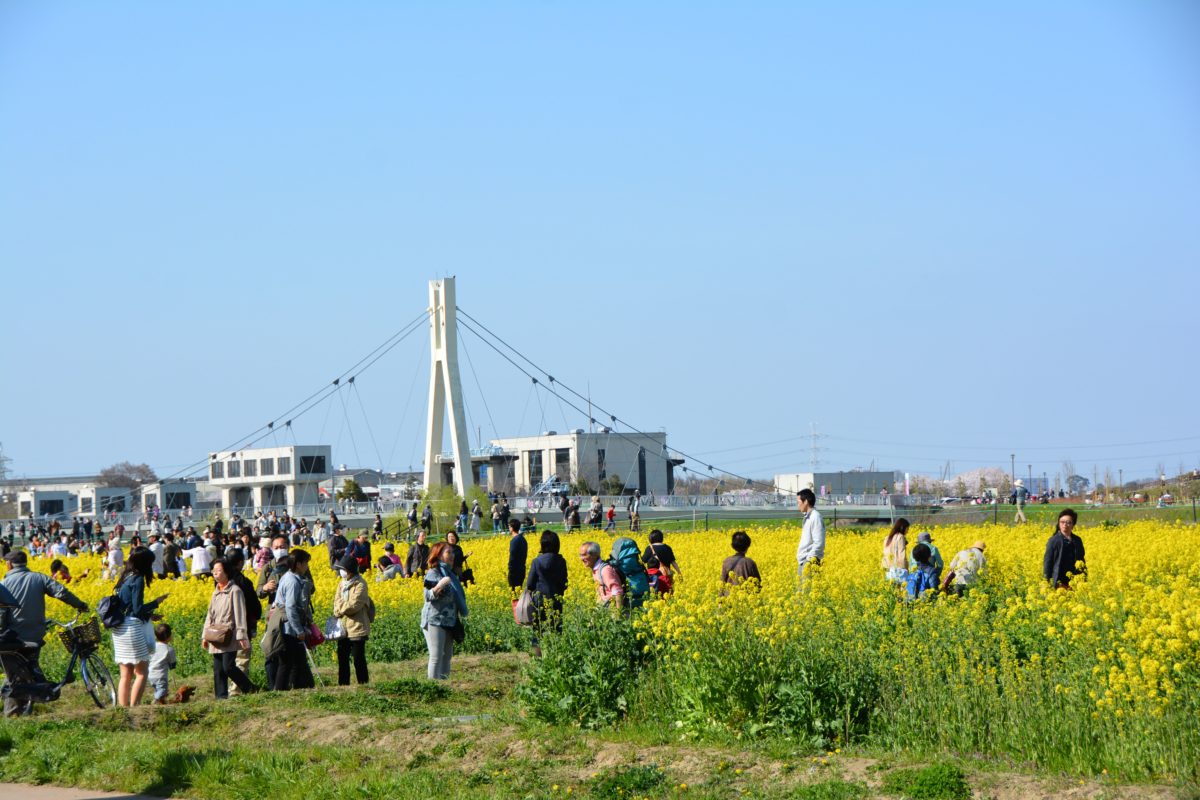 桜堤を散策するだけでも春を満喫できますが、権現堂の魅力はそれだけに留まりません。さらに気分を盛り上げてくれるものが堤の下に広がります。桜堤と中川の間は、いちめん菜の花畑です。桜の薄紅色と菜の花の黄色が見事な色彩のコントラストを見せています。