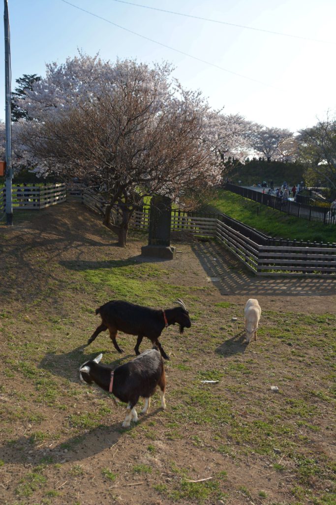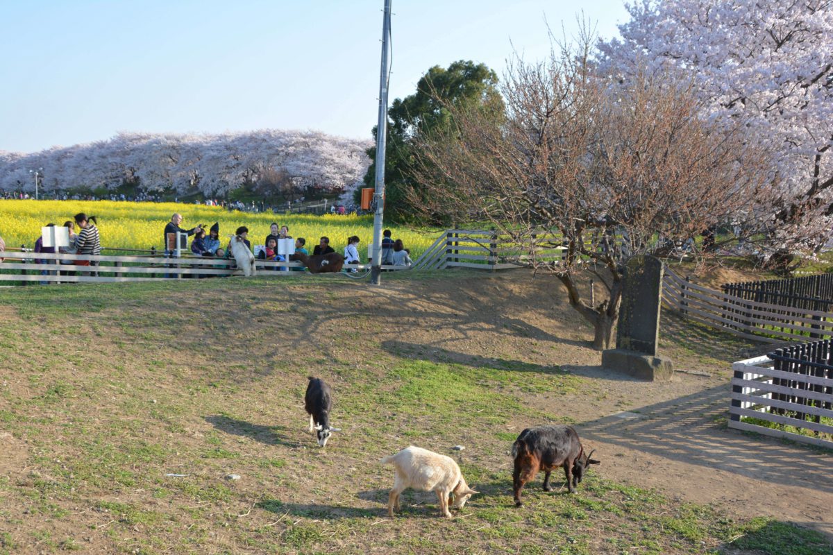 また、菜の花畑の一画には小さな牧場が設けられています。数頭のヤクシマヤギが春の風に吹かれているので、お花見の合間に動物と触れ合うもできます。