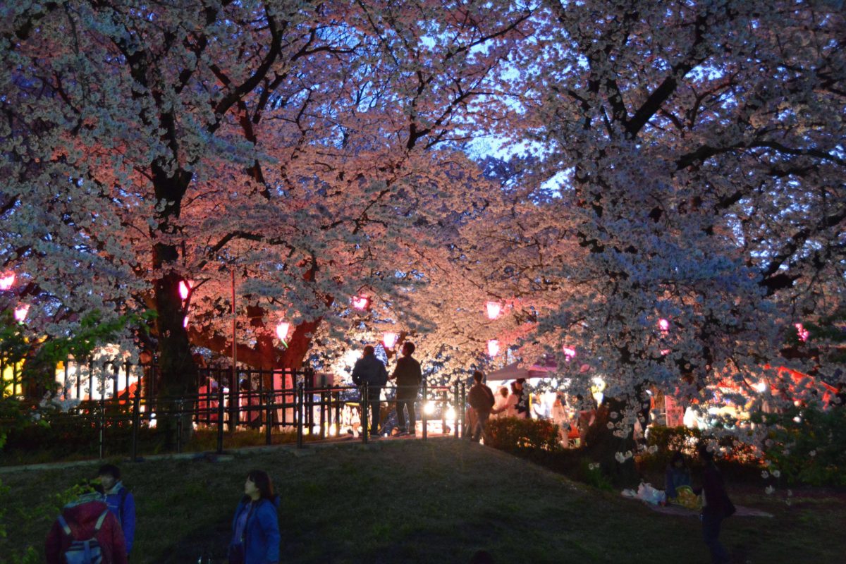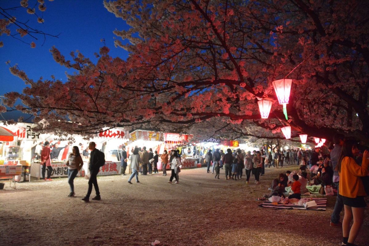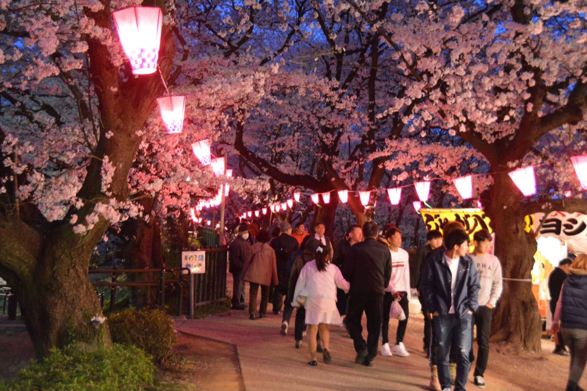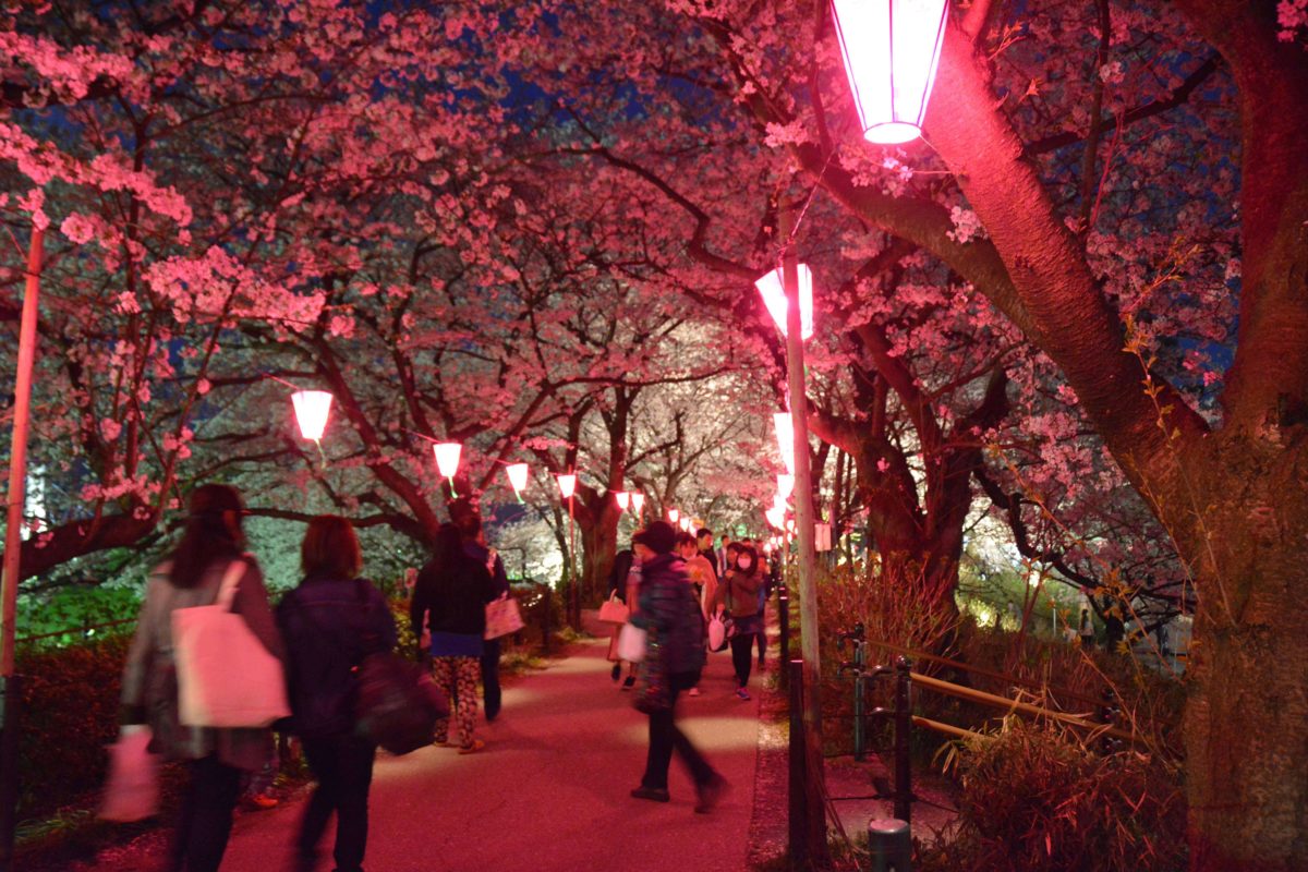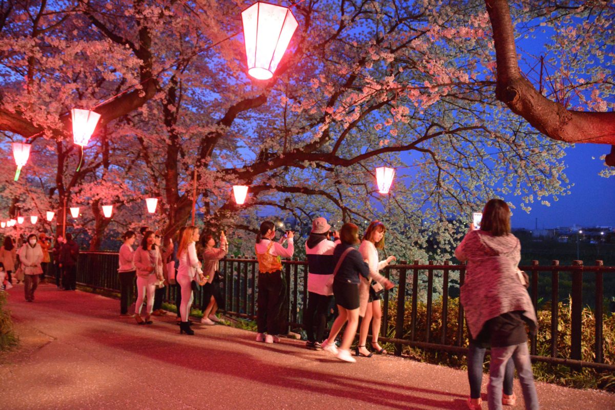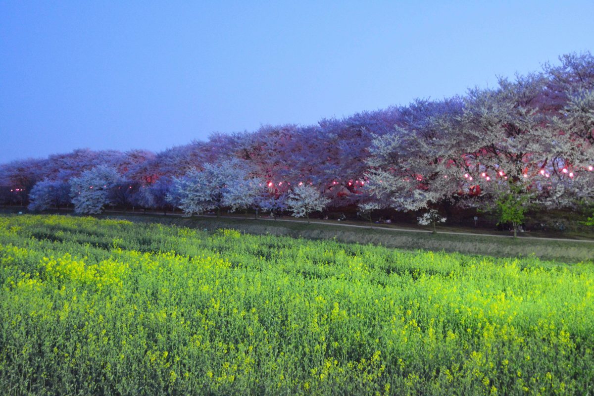 桜と菜の花の色彩の競演にさらに彩りの変化を加えるのが、夜間のライトアップです。薄紅色の並木と黄色の絨毯がファンタジックに彩られます。