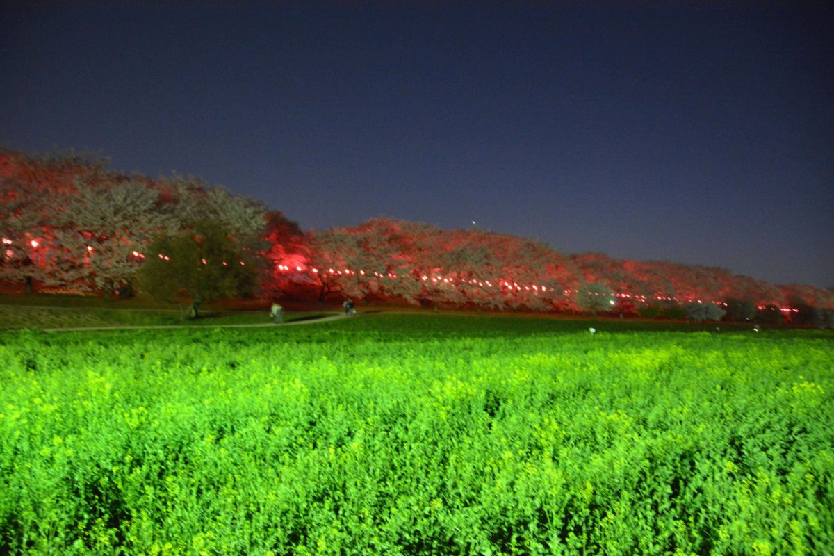 桜と菜の花の色彩の競演にさらに彩りの変化を加えるライトアップ