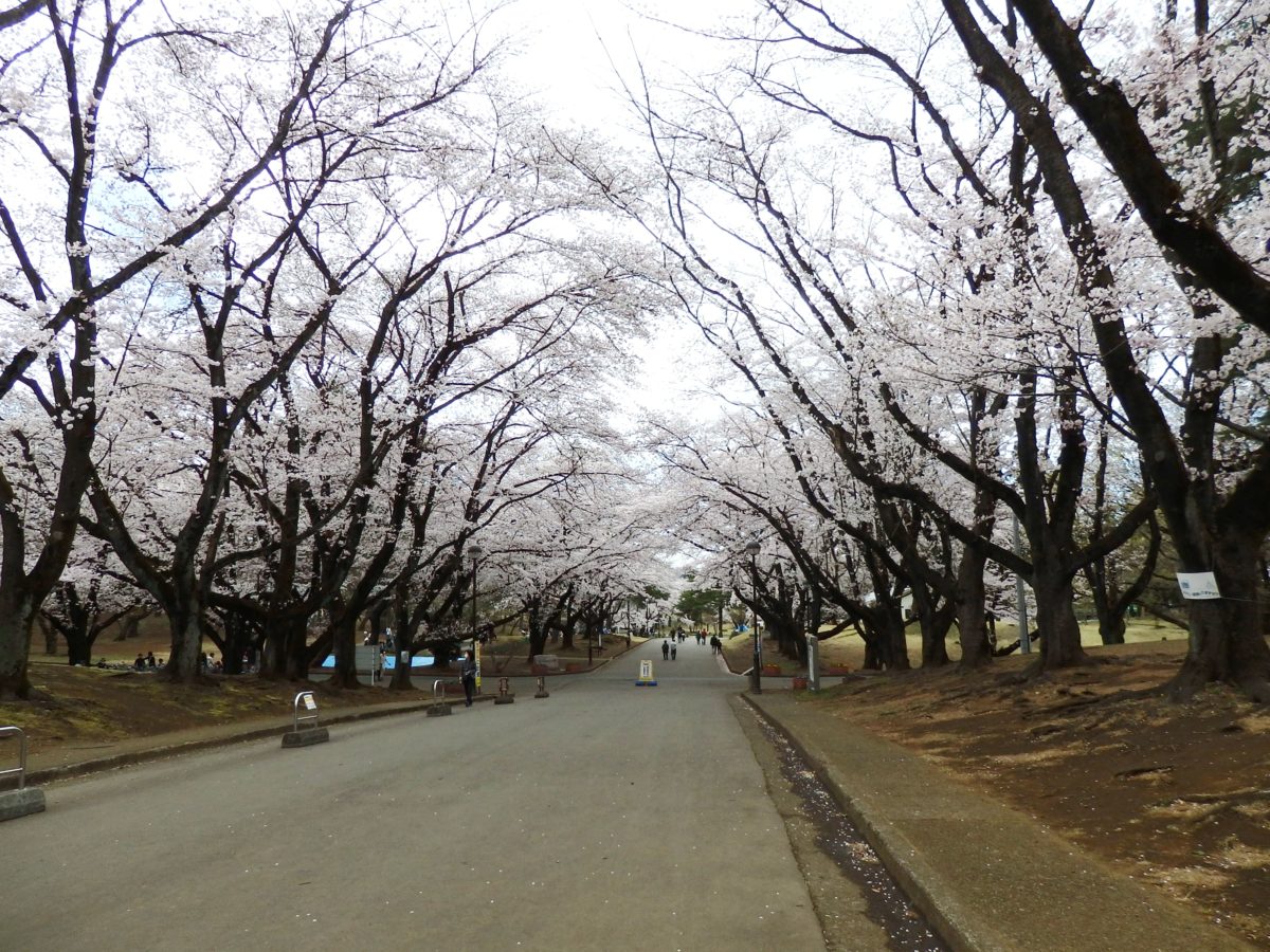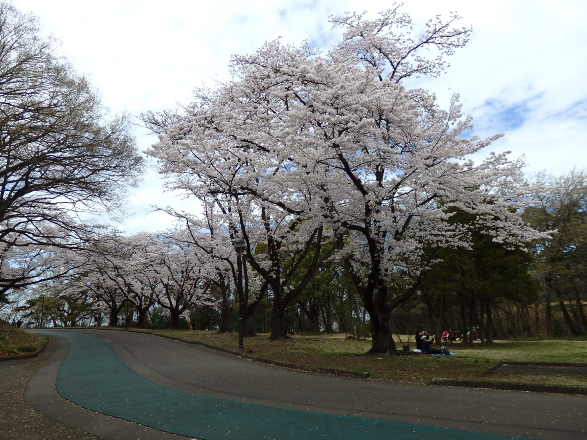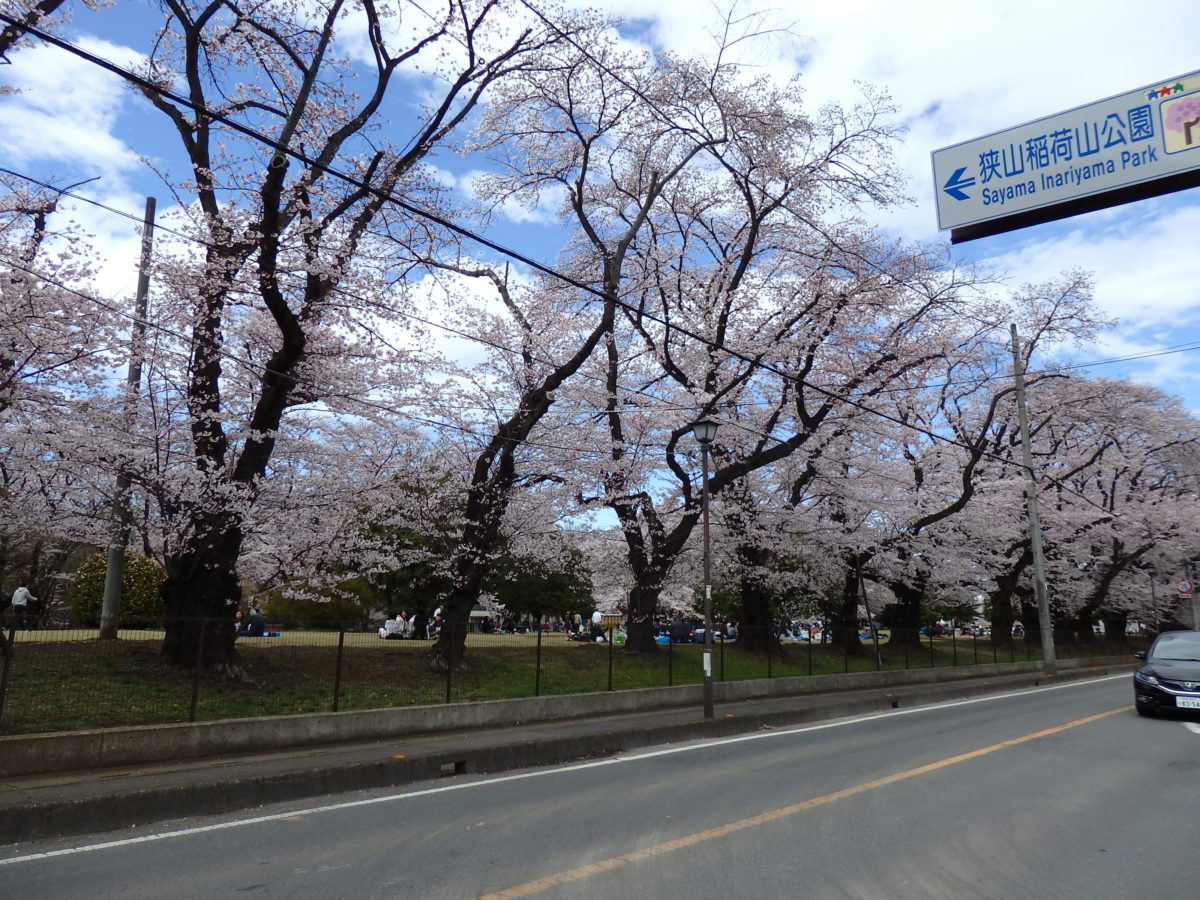 狭山稲荷山公園は、西武池袋線の稲荷山公園駅の正面にあります。約16.5ヘクタールの園内を一周するようにジョギング・ウォーキングコースが設けられています。幅の広い道路なのですが、左右に並ぶ桜が長い枝を張り出しているので、頭上は桜の花で覆われます。