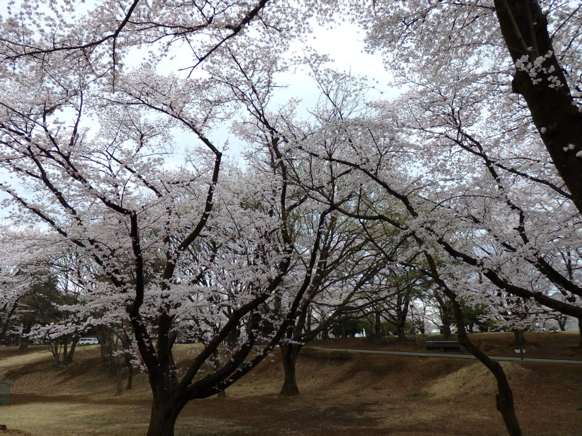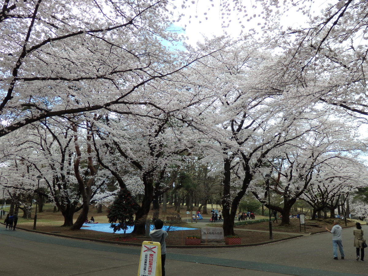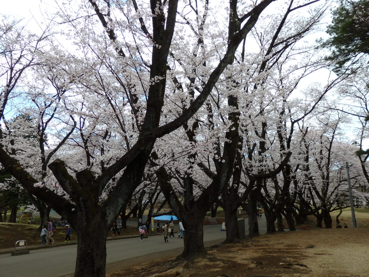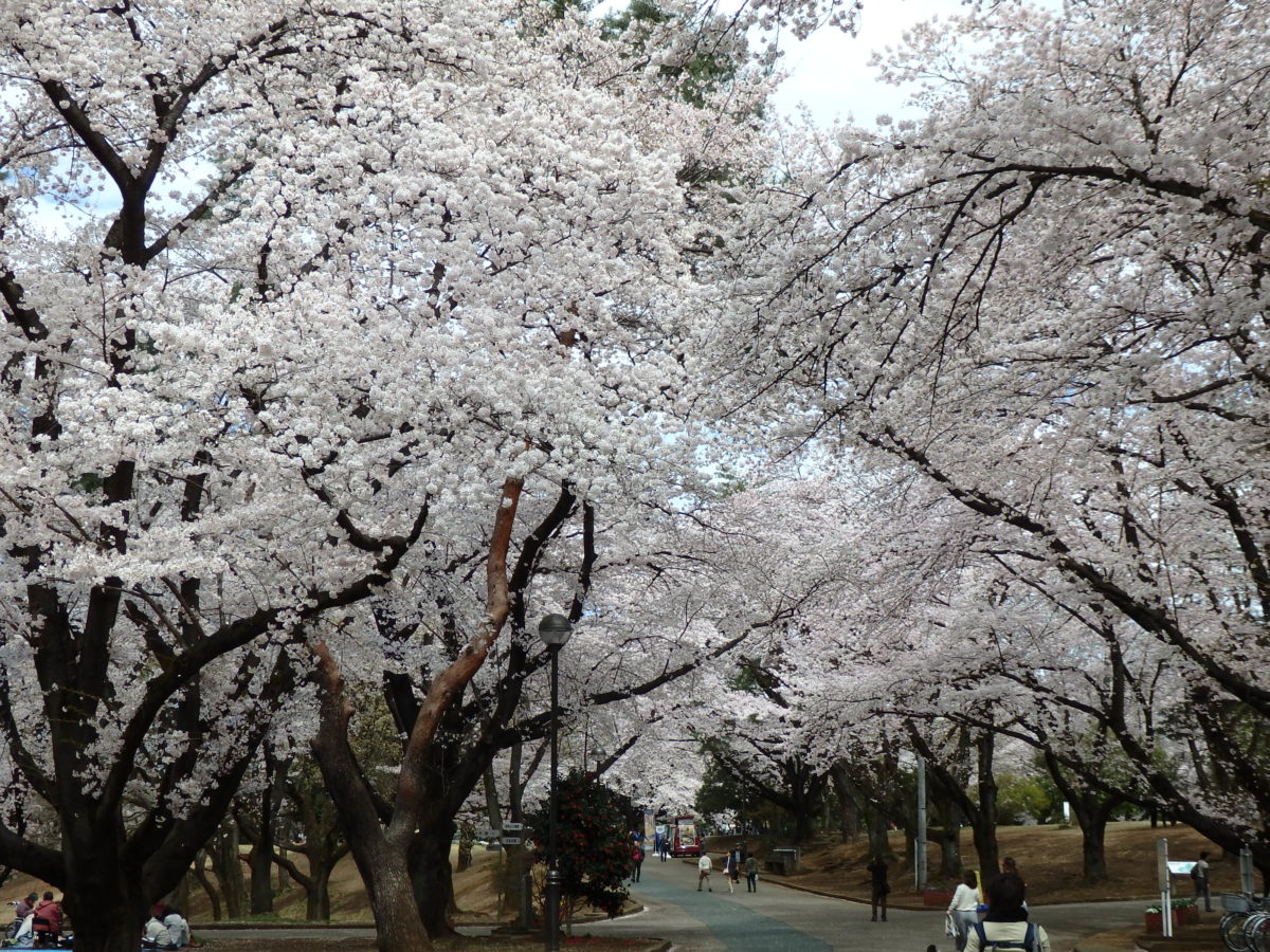 狭山稲荷山公園は、西武池袋線の稲荷山公園駅の正面にあります。約16.5ヘクタールの園内を一周するようにジョギング・ウォーキングコースが設けられています。幅の広い道路なのですが、左右に並ぶ桜が長い枝を張り出しているので、頭上は桜の花で覆われます。