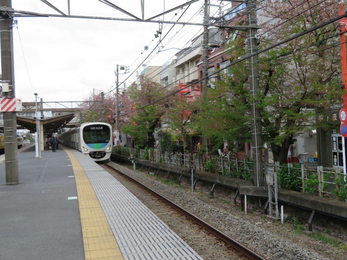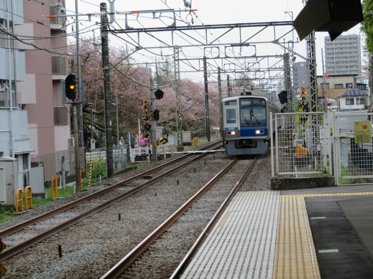 桜並木を横目に武蔵関駅のプラットホームに入線する西武新宿線の車両