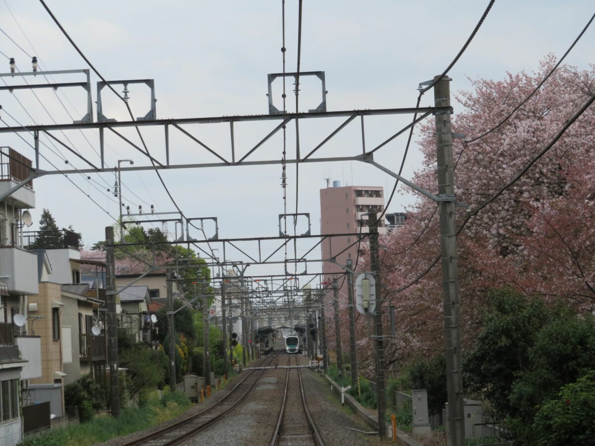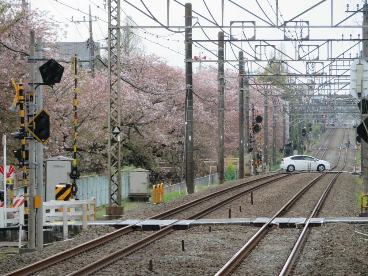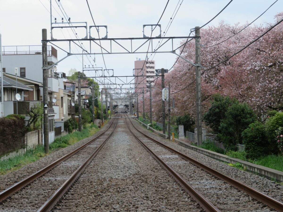 武蔵関公園の東入口近くの踏切からは、西武新宿線の線路沿いに桜並木が一直線に繋がっています。