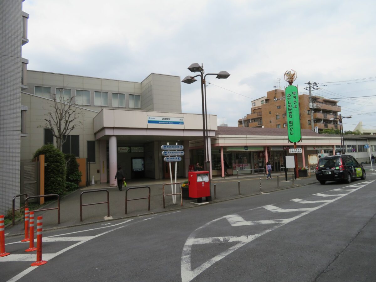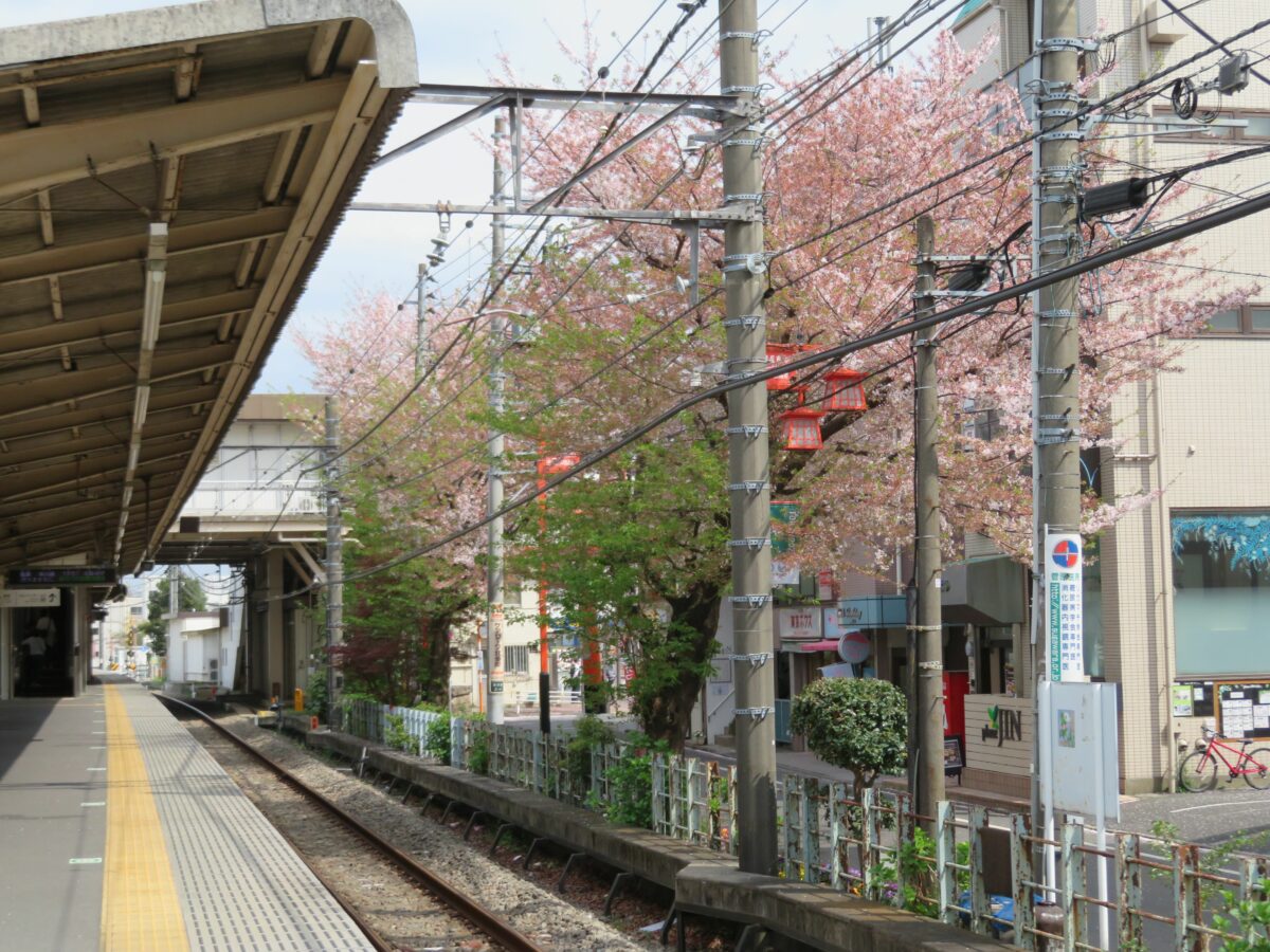 武蔵関駅を発車した西武新宿線の下り列車は、約2分で東伏見駅に到着します。東伏見駅は東伏見稲荷神社の最寄り駅となっています。駅前には鳥居が設けられ、桜の花で彩られます。
