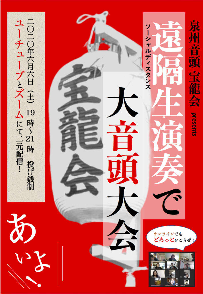 コロナで自粛が続く中、コツコツと音頭の生演奏&生配信の実験を繰り返してきた泉州音頭 宝龍会さんが、ZOOMとYouTubeを活用した大音頭大会を開催する運びとなりました。YouTubeで配信を見るもよし、ZOOMで踊りに参加するもよし、音頭を楽しみながら酒を飲むもよし! YouTubeからはスーパーチャットで投げ銭をしていただくことも可能です。