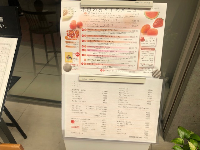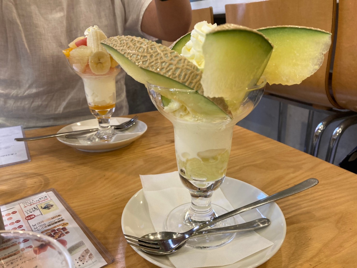 ずっとあこがれていた店に入店。何にしようかと悩みながら選んだのは、数種類の果物の味を同時に味わえる本日のフルーツパフェ(¥1000)。友人はマスクメロンのパフェ(¥1600)に決定。