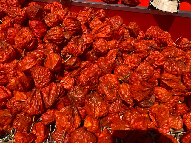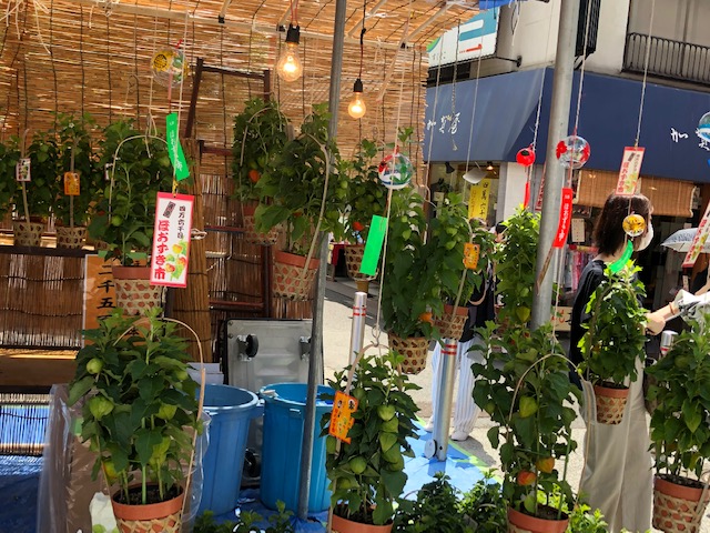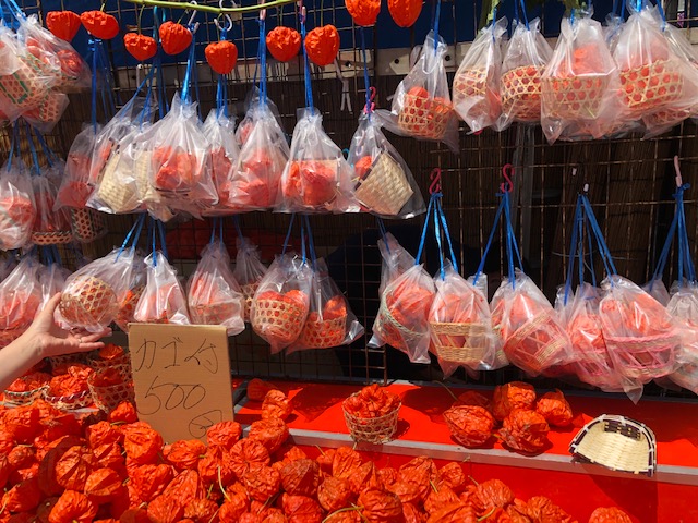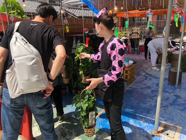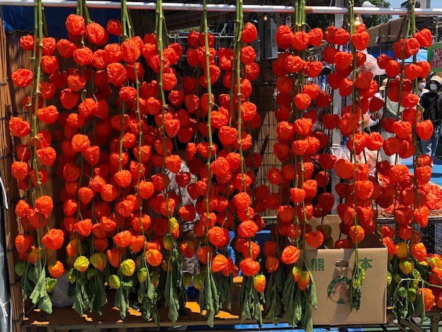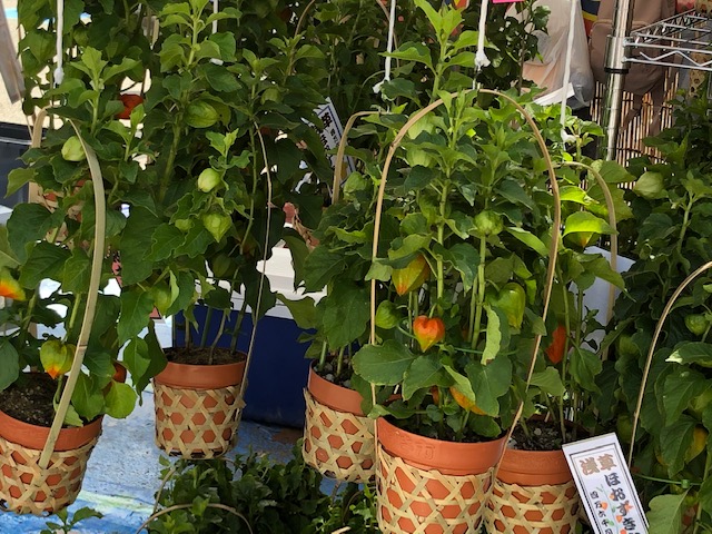 風鈴のついた鉢植えタイプのほおずきはどの店も2500円で統一されているそうです。他にもつるすタイプのものは1000円(長いものは2000円)、ほおずきの実が3個ほどかごに入ったもの500円など、いくつか種類がありました。