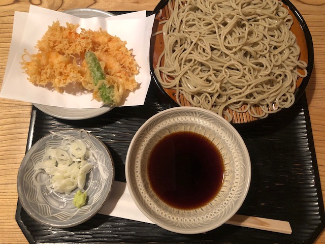 揚げたての小エビとししとうの天ぷら、そして細目のざるそば。きめの細かい滑らかなそばに濃いめのつゆがさくさくの天ぷらによく合います。サクサク感が損なわれないうちに蕎麦とともにつるりと。蕎麦も固すぎず柔らかすぎず。そして程よいタイミングで蕎麦湯が登場。食べ終わって蕎麦湯をゆっくりいただいて、大満足のおいしい蕎麦でした。美味しんぼに出てくるというのもうなずけます。