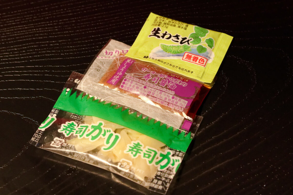 「がり」「しょうゆ」「わさび」も一袋ずつ付いてきます。家族や友達とシェアする場合は足りないと思うので、別途人数分用意しましょう。