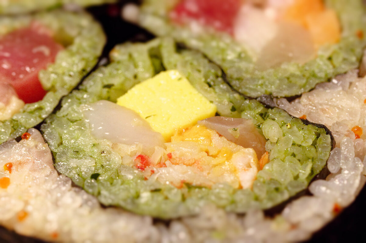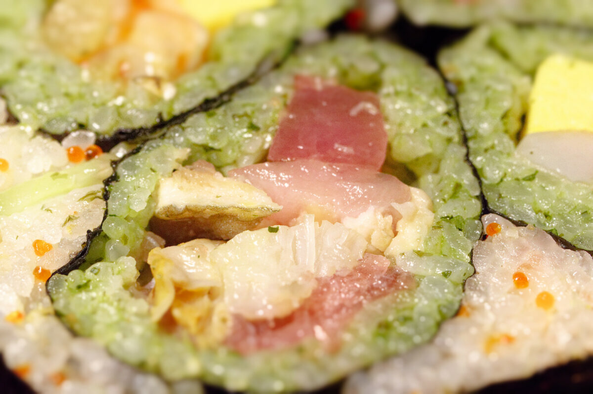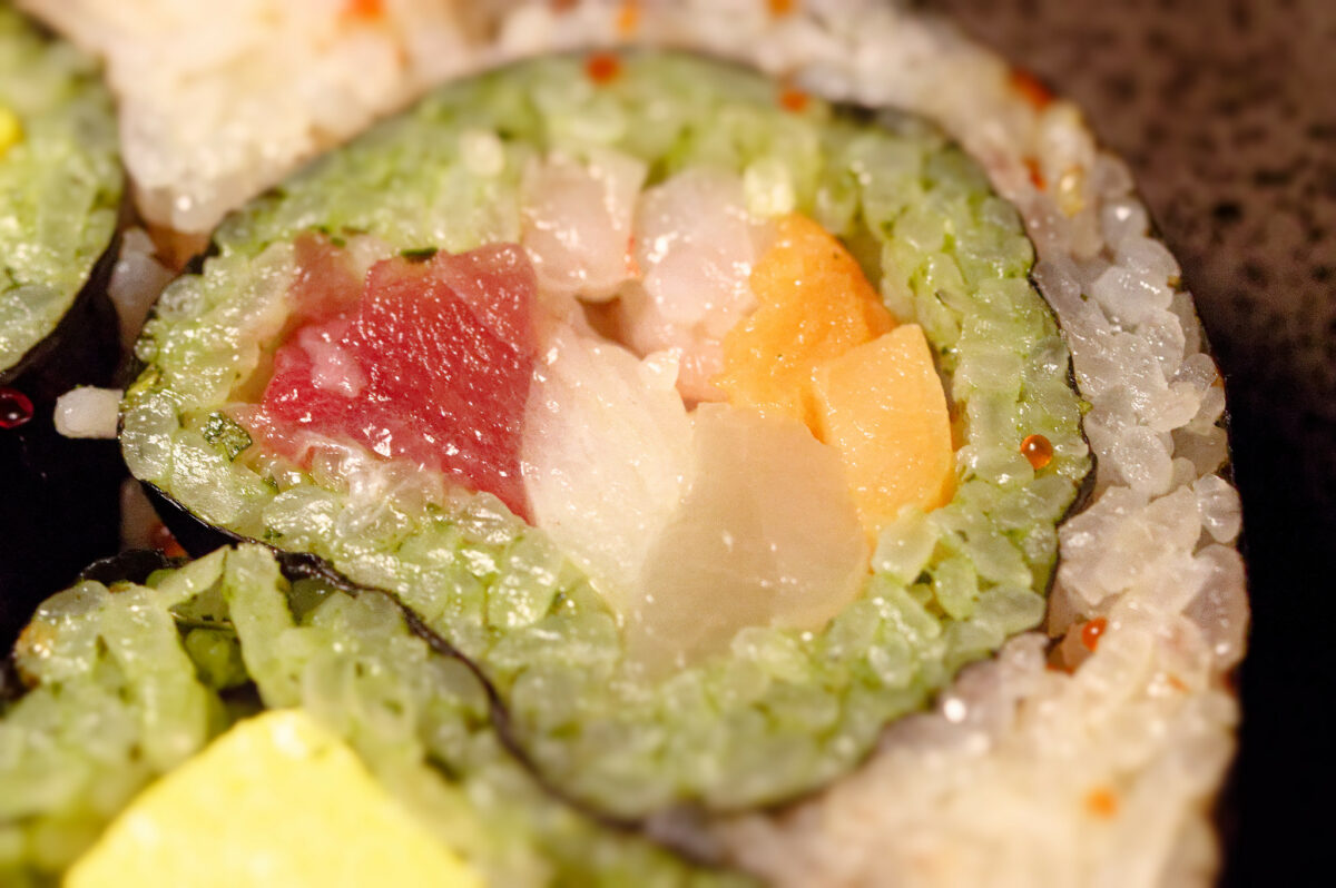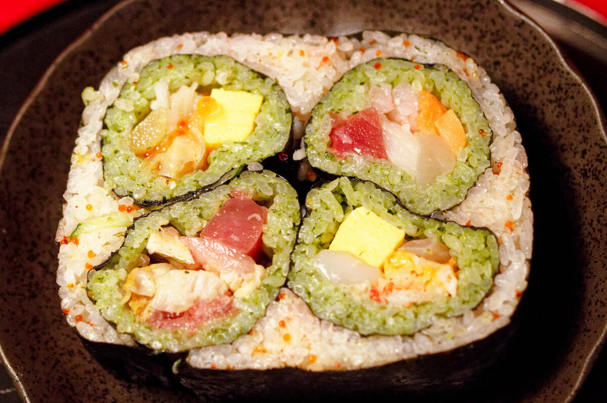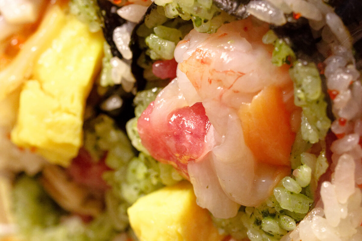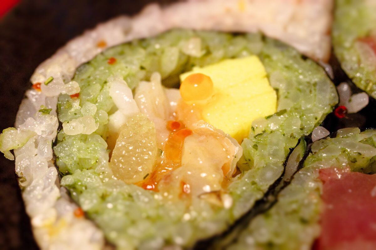 溢れんばかりの海鮮!よく見ると、四つの“葉”にはそれぞれ異なる具材の組合せとなっているんですね。さらに、葉っぱの部分は抹茶を混ぜた舎利でできていて、見た目も豪華な装い。美味しそうな四つ葉のクローバーをSNSに投稿して、幸せな気分をみんなと共有しませんか。