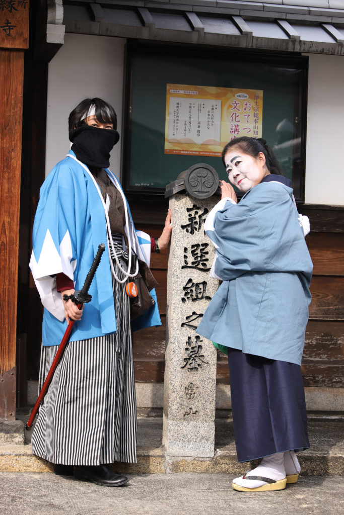 今年の司太夫は新選組の着流し。近くの光縁寺にある新選組之墓でもパチリと記念撮影。