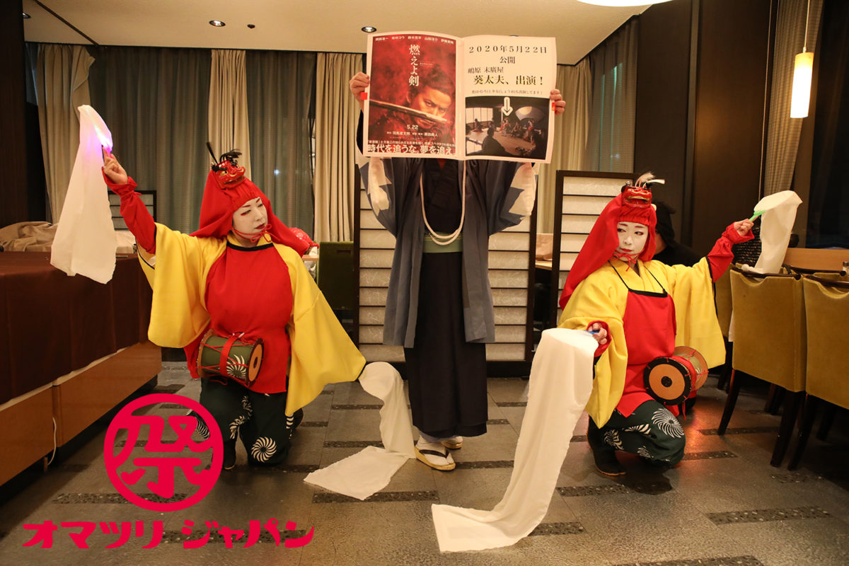 そして決めポーズ!司太夫が持っているのは葵太夫が出演する映画「燃えよ剣」の告知。