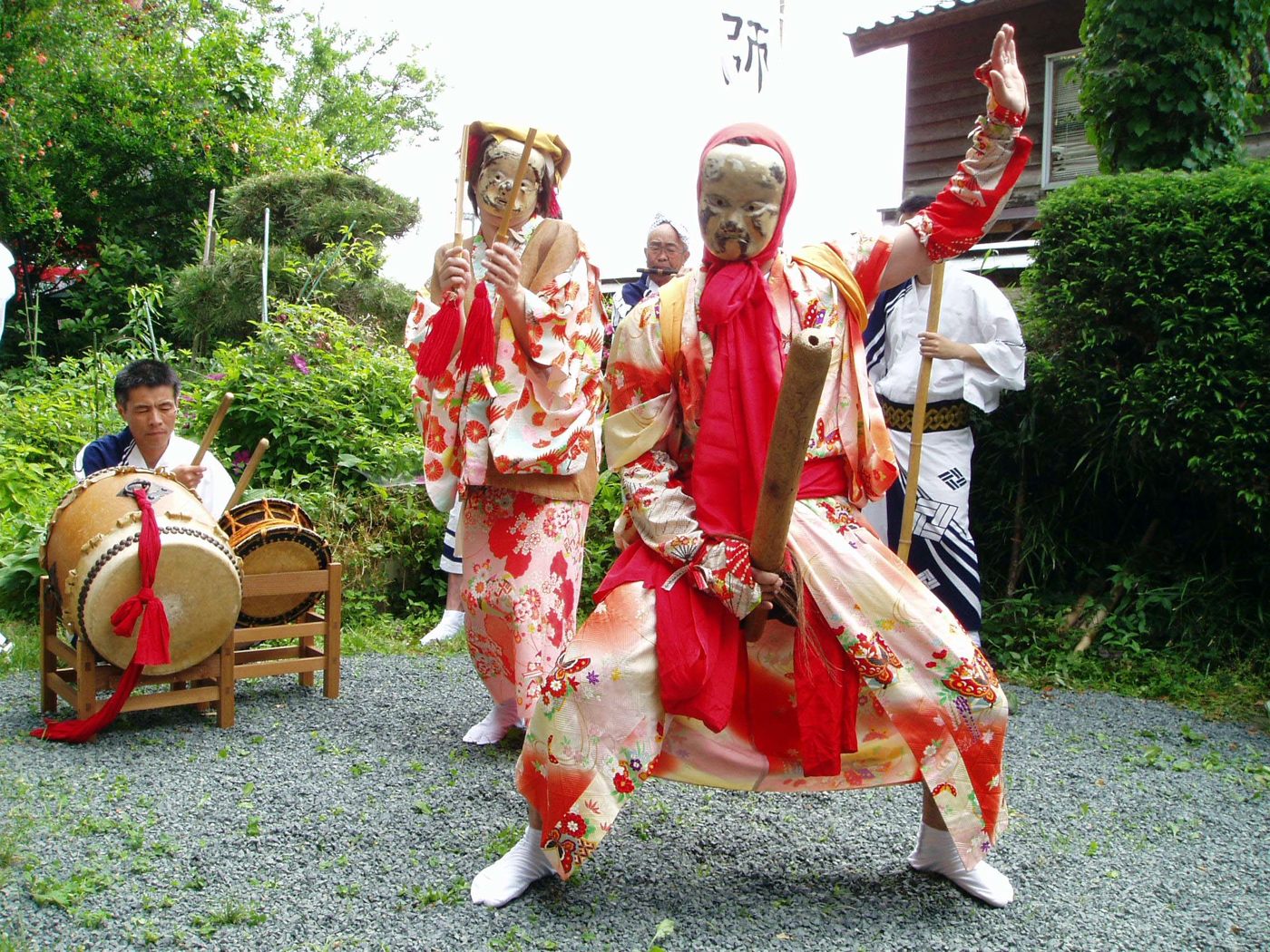 赤を基調とした華やかな衣装に、男根に似せた木の棒を持ってぶん回すというロックな神楽「太神楽つぶろさし」(寺田集落)、「鬼舞つぶろさし」(村山集落)、「妹背神楽」(飯岡集落)を町内のいたる所で舞い踊る奇祭。男性の「つぶろさし」だけでなく、女性の「ささらすり」の舞にも要注目! また鬼太鼓や神輿がくり出し、3匹の大獅子や子供たちや学生による「鼓笛隊」「おけさ流し」も登場。夜には、草苅神社の能舞台で奉納薪能も行われます。草苅神社と菅原神社の例祭です。