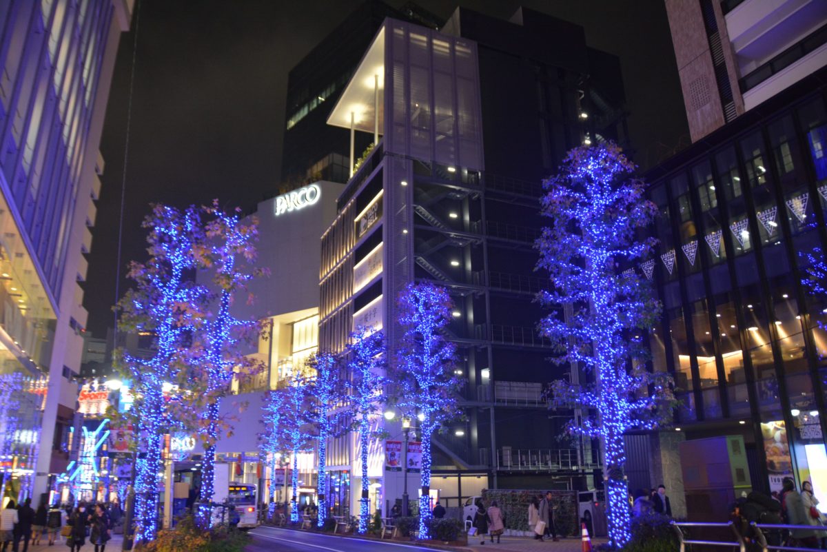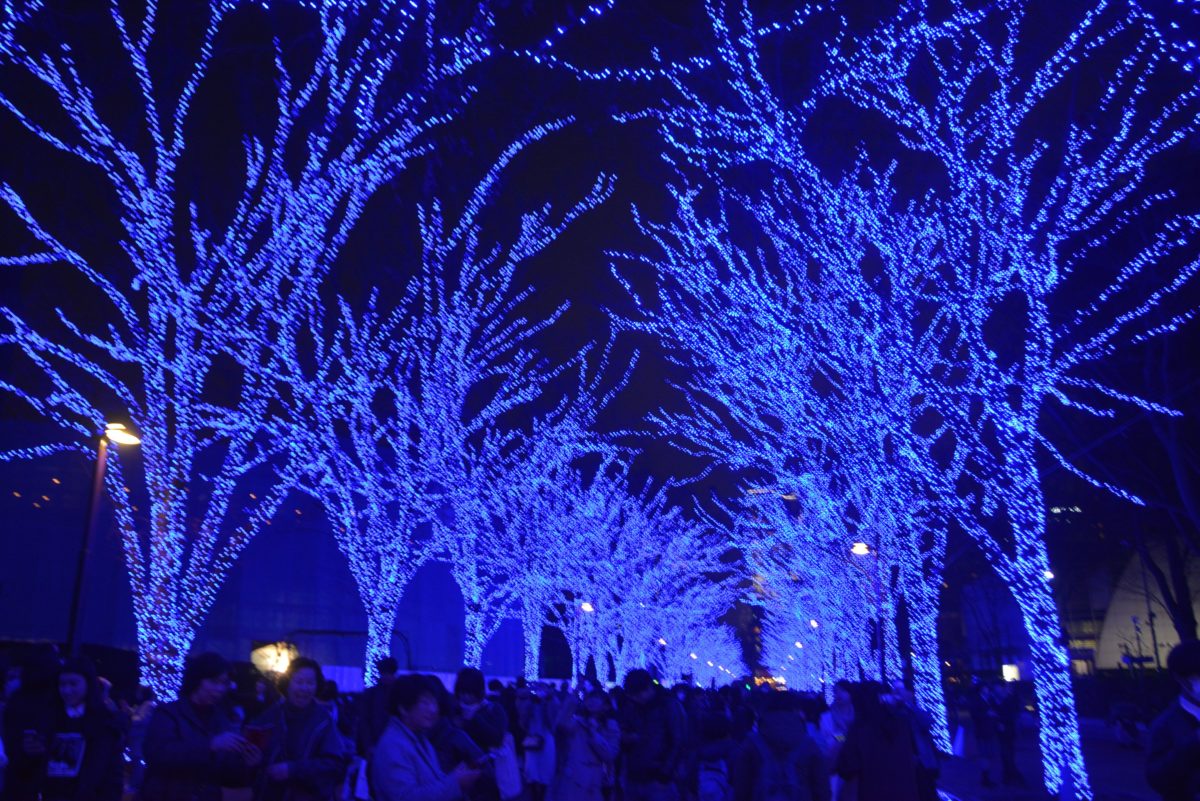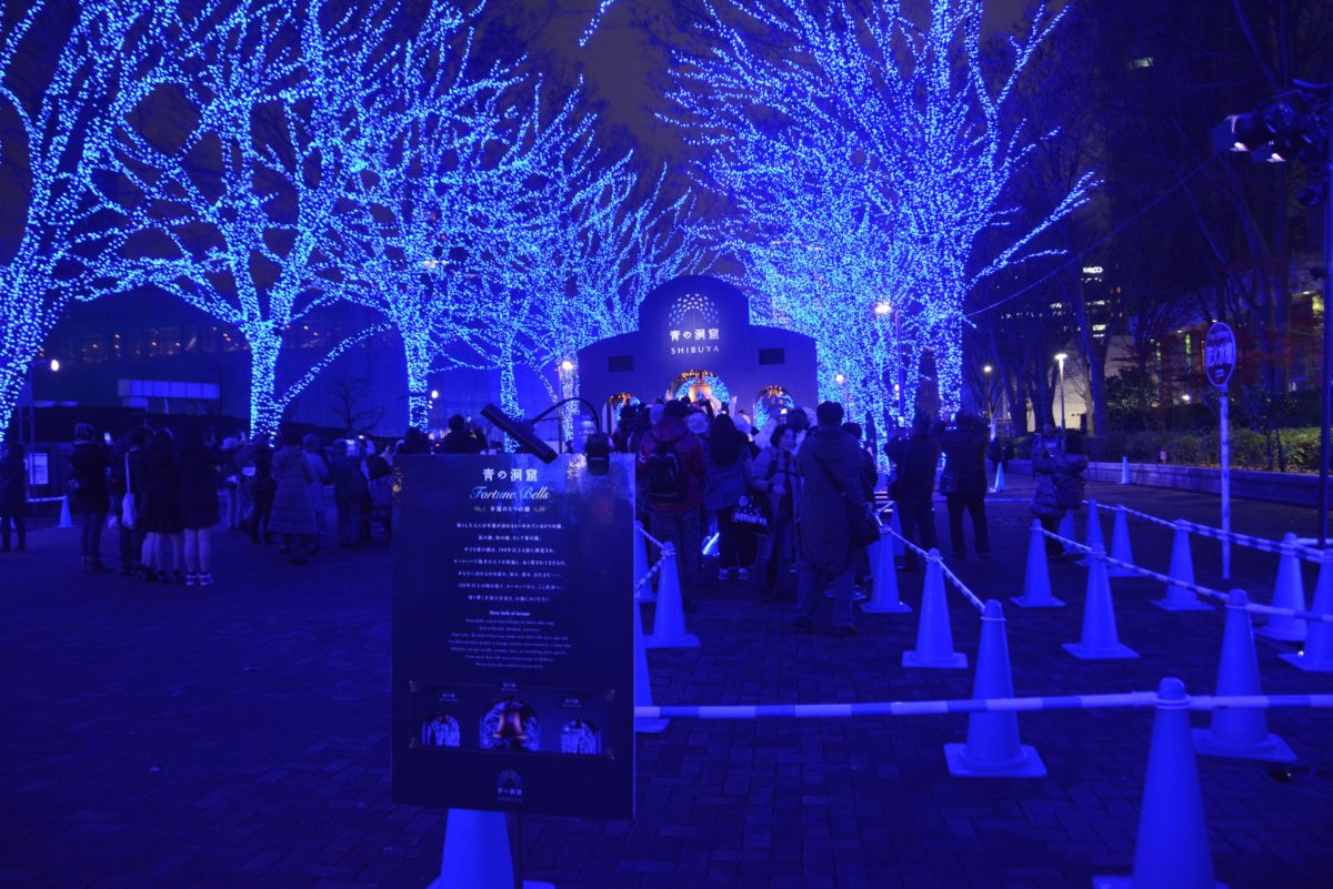 渋谷公園通りに踏み出せば「青の洞窟」の中に入り込んだことになります。通りは青一色のイルミネーションで照らし出されます。青のライトが並木道を作り波打つかのようです。