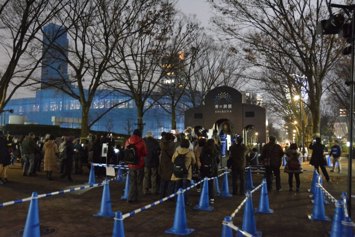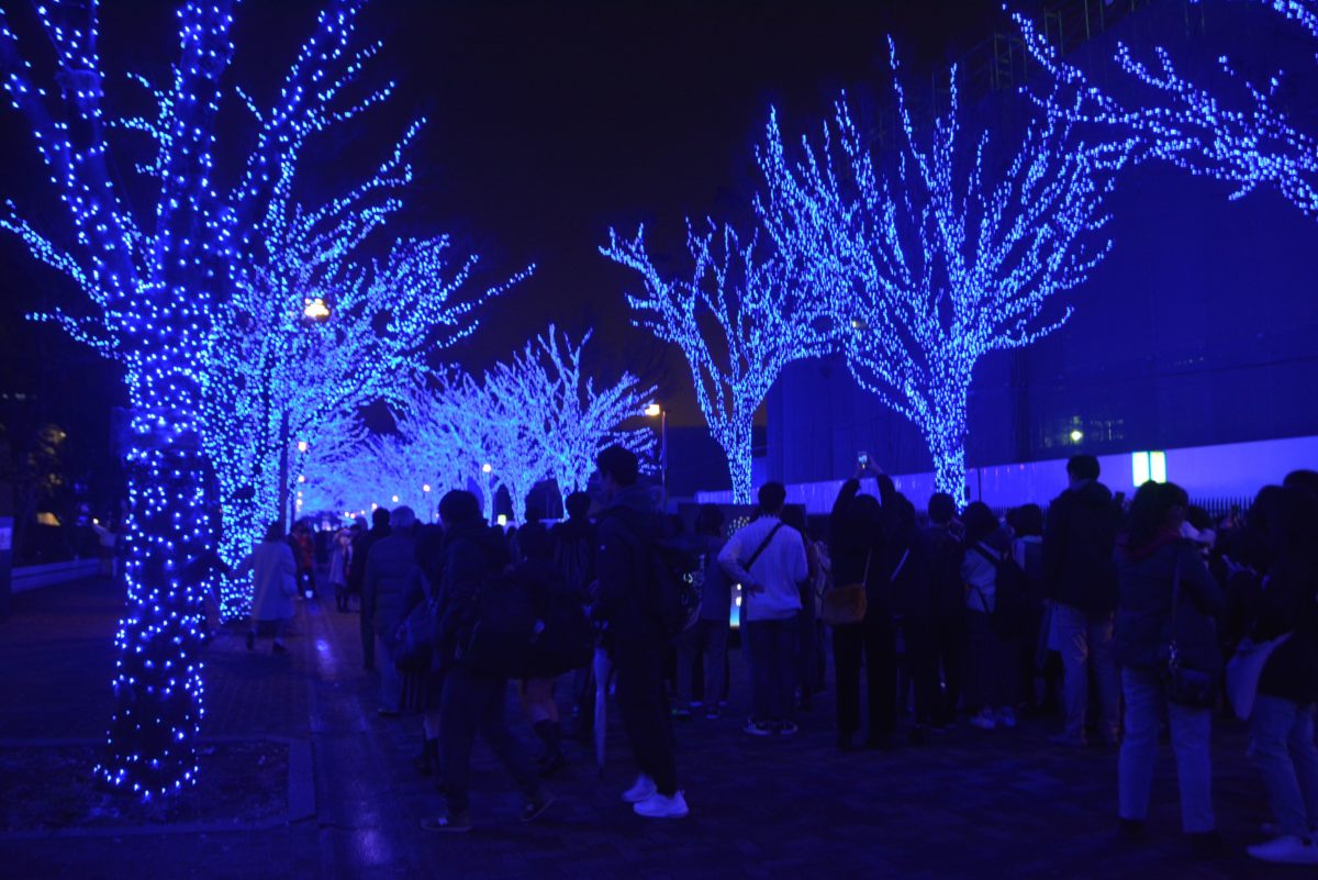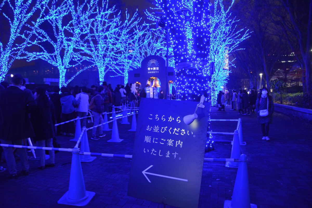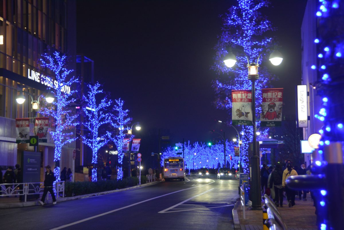青のイルミネーションが並木のように波打つ渋谷公園通り