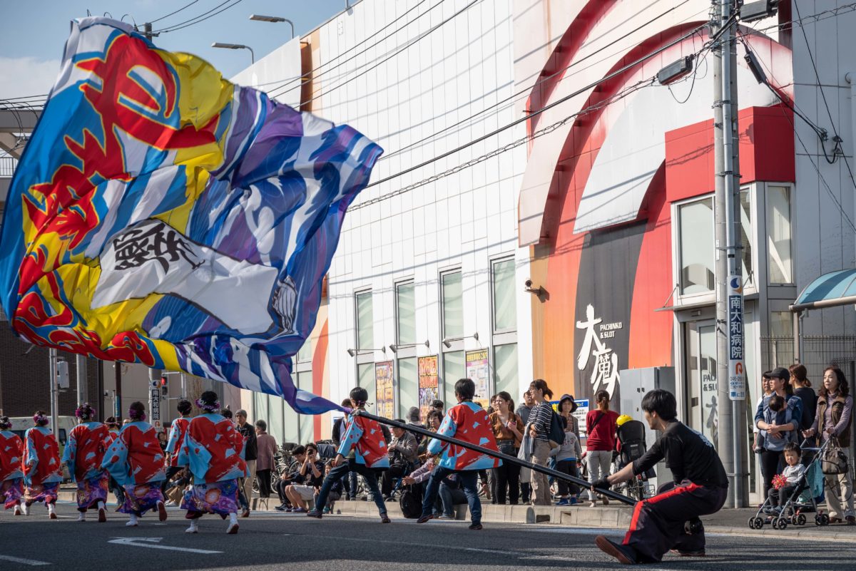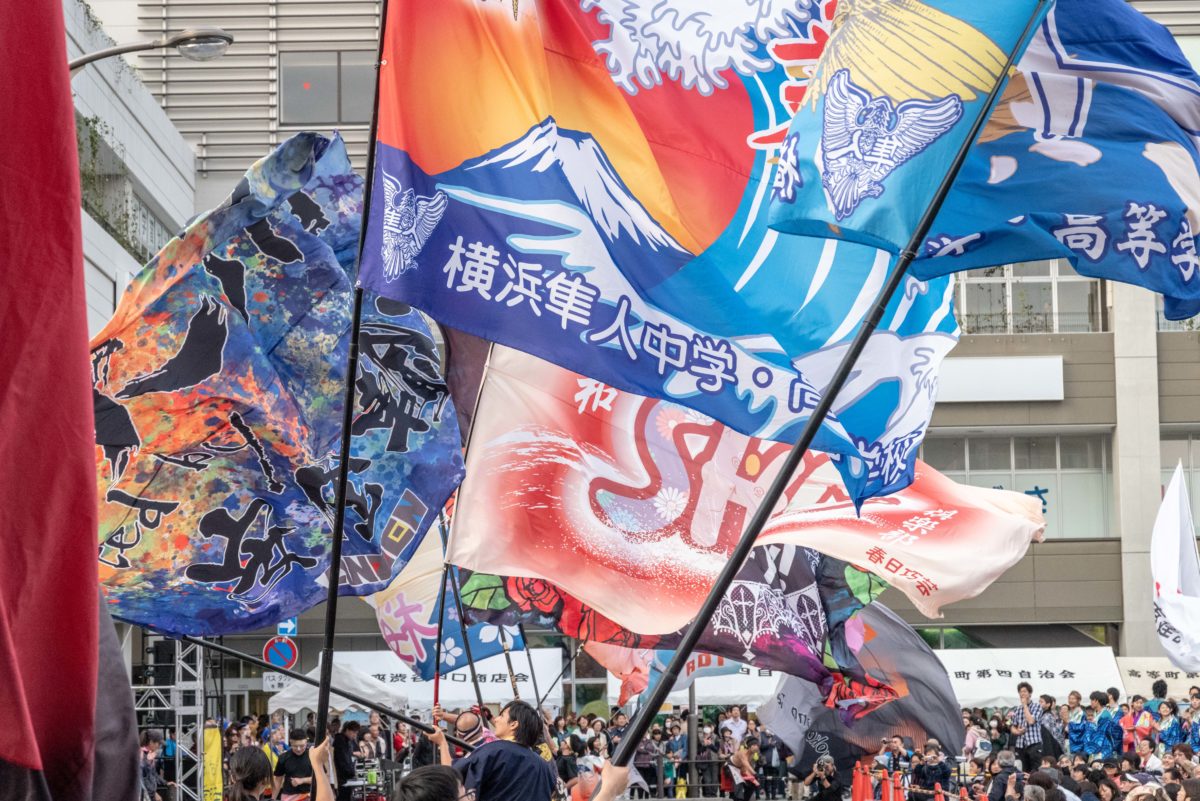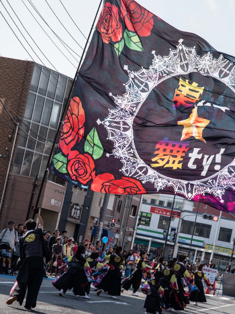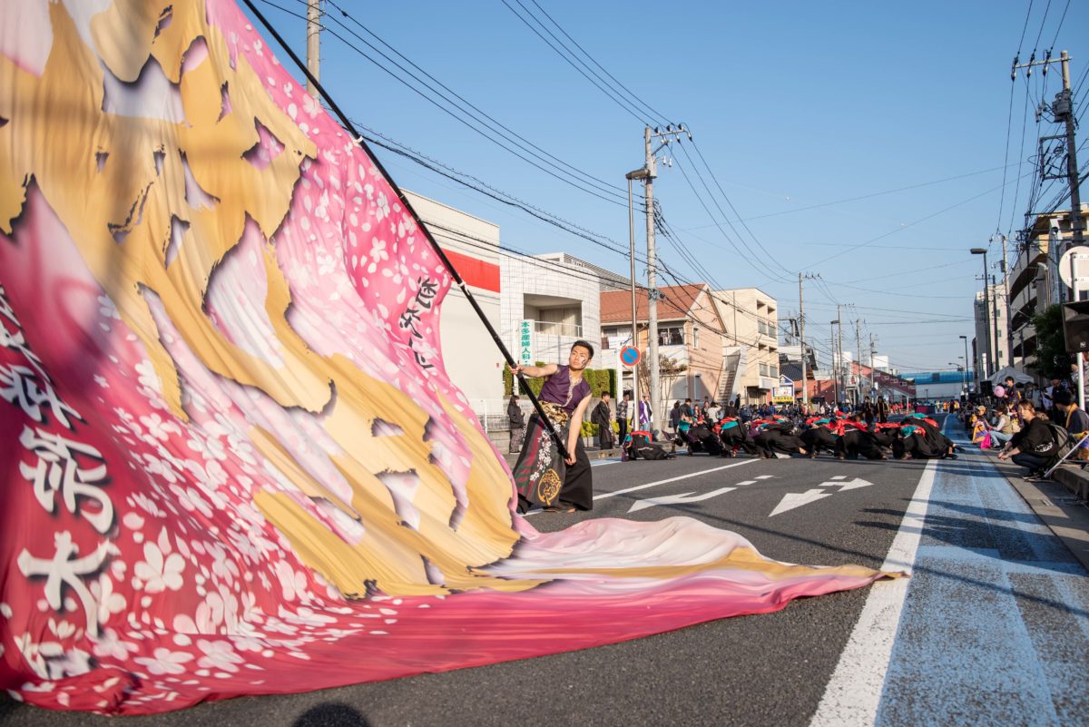 よさこいで一つ目を惹くのが、高知の大漁旗に端を発するこのよさこい旗。持つだけでも大変そうなのにそれを振り回すのは至難の業のように思いますが、体重移動などをうまく使い、てこの原理のように旗を持ち上げるのだそうです。「コツがつかめれば女子でもできるんですよ!」と語るのは手伝いで来ていたOGの元旗振りさん。