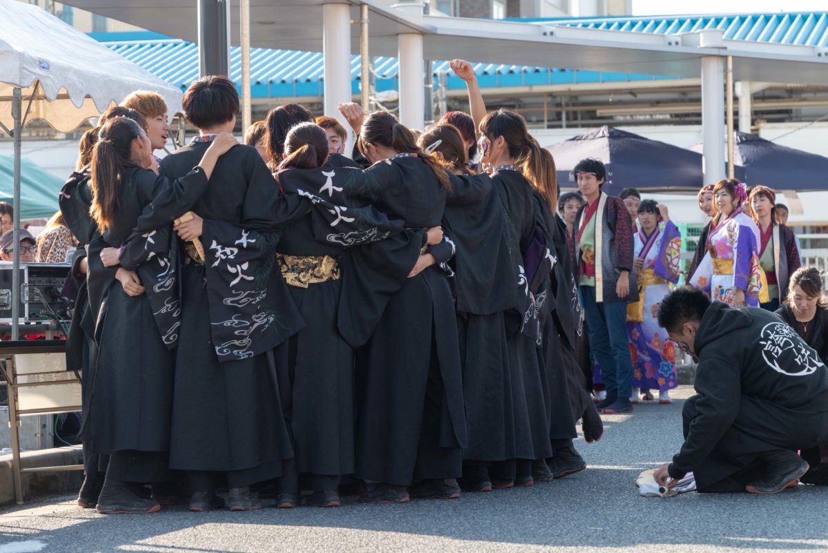 演舞前に円陣を組む誇咲のメンバー達。黒づくめの衣装が目を惹きます。