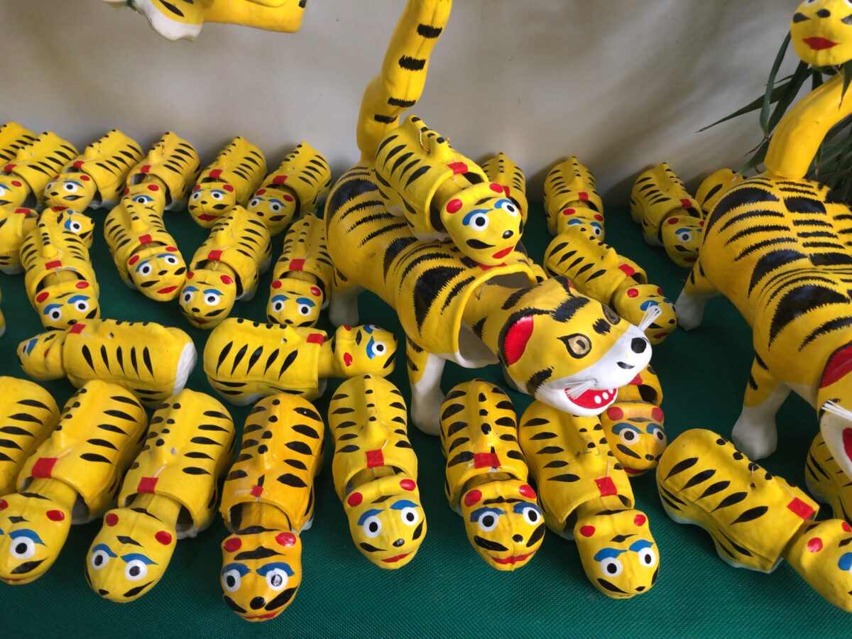 ごらんください、この祭壇。並んでいるのは、全て信貴山の縁起物である寅の張り子や置物です。