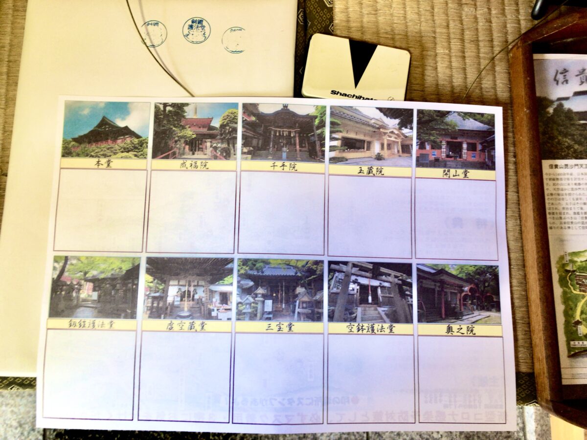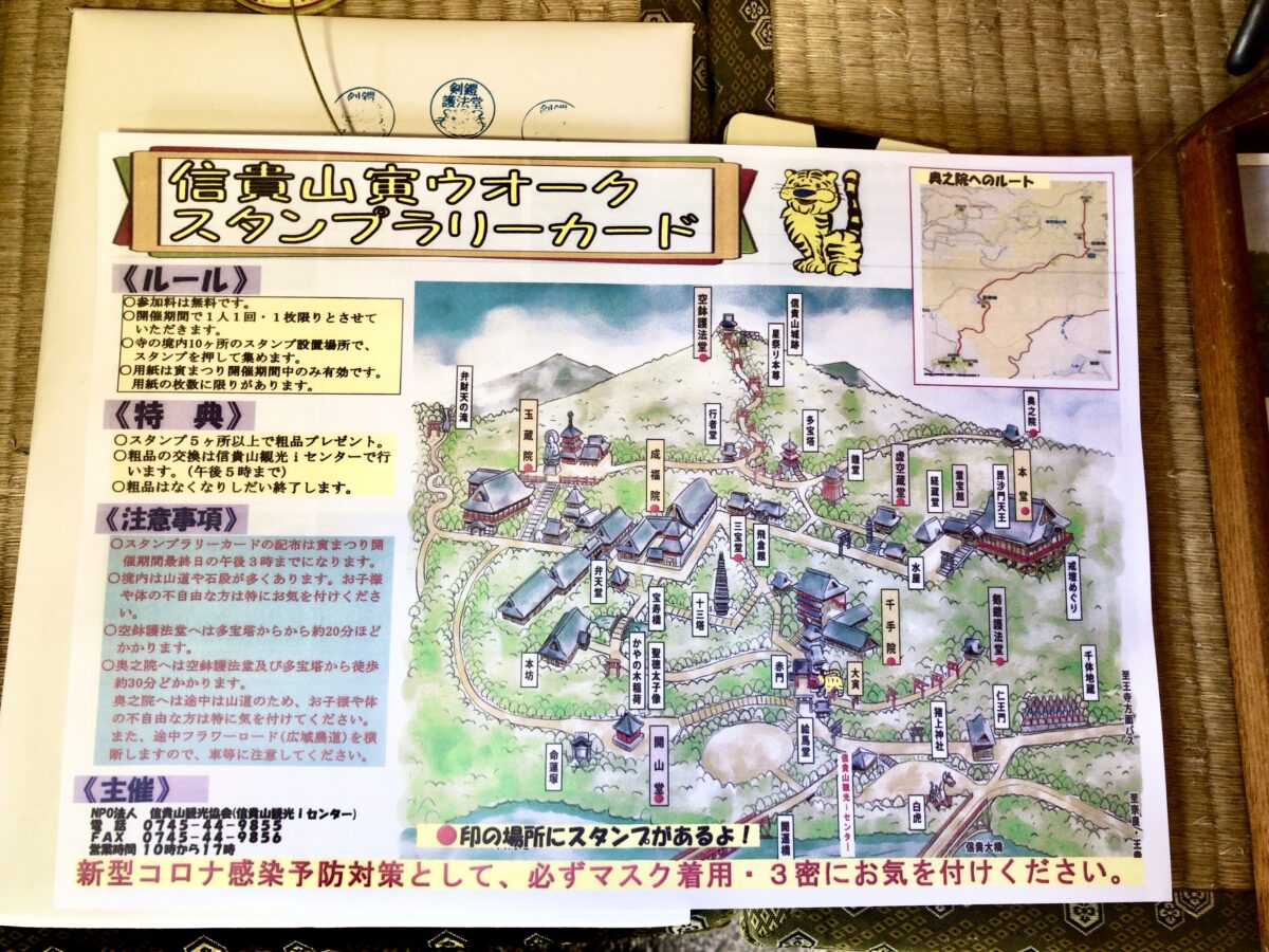 信貴山案内図には、裏面がスタンプラリーになっているものも用意されています。スタンプラリーは参加無料です。また指定された全ての場所を巡ってスタンプを集めると、記念品をいただけるとのこと。