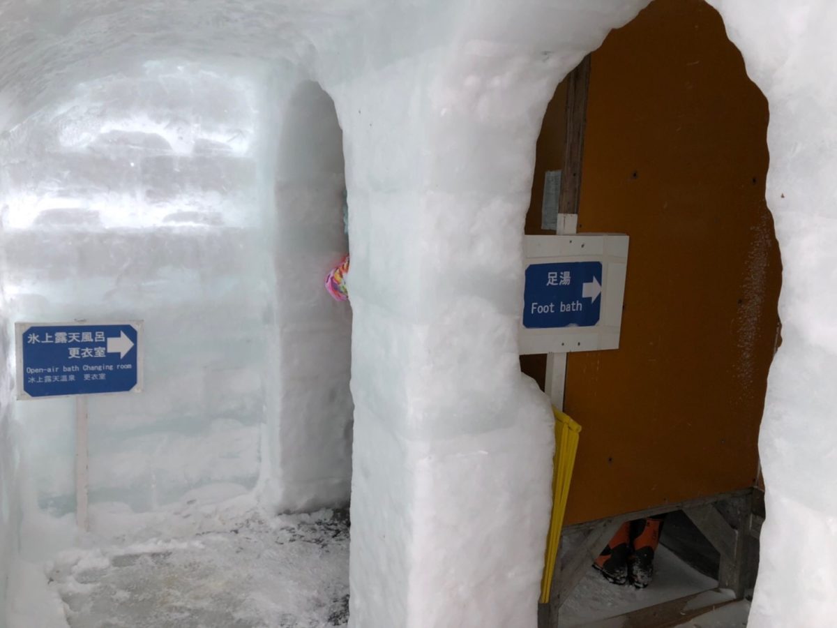 入ってすぐの氷でできたアイスバーに、体が吸い込まれそうになりましたが、ここは我慢。お風呂上がりの一杯を楽しみに、まずは旅の目的である氷上の温泉を目指します。