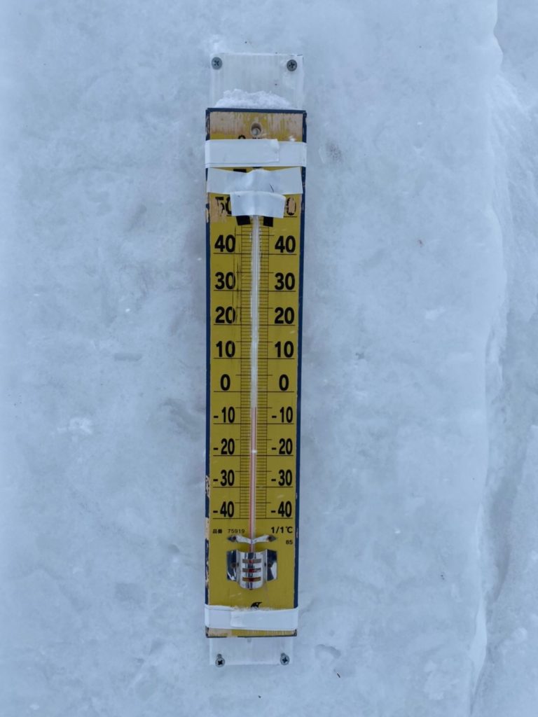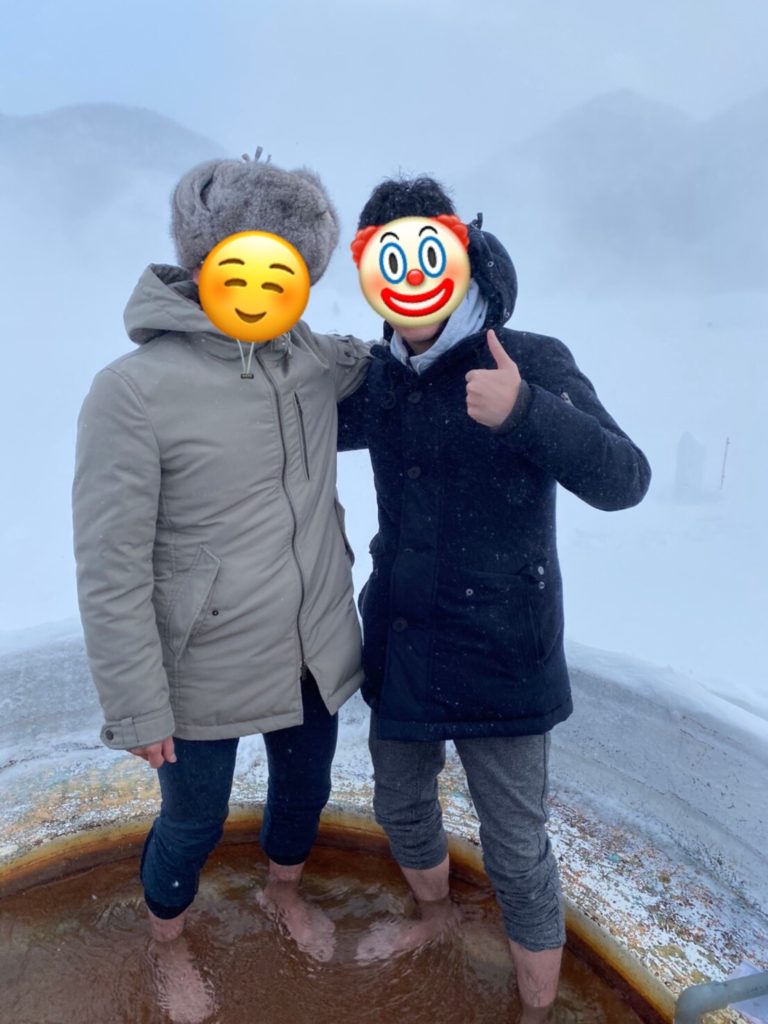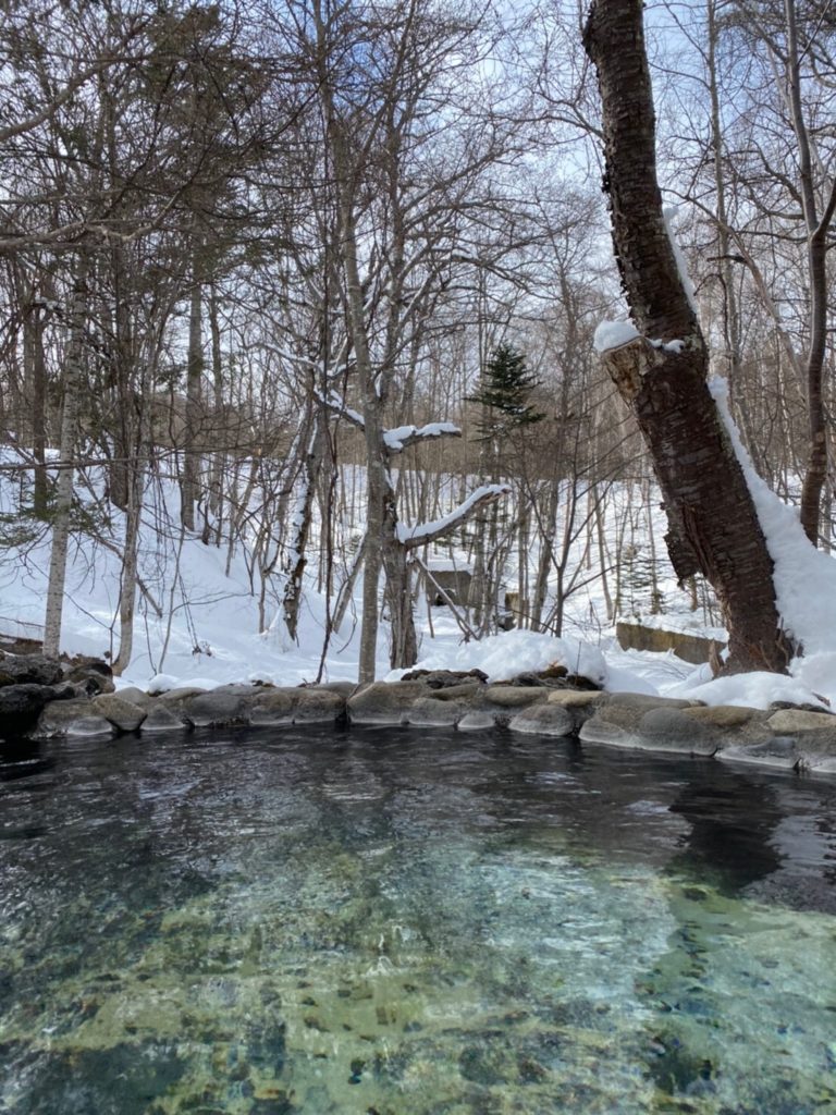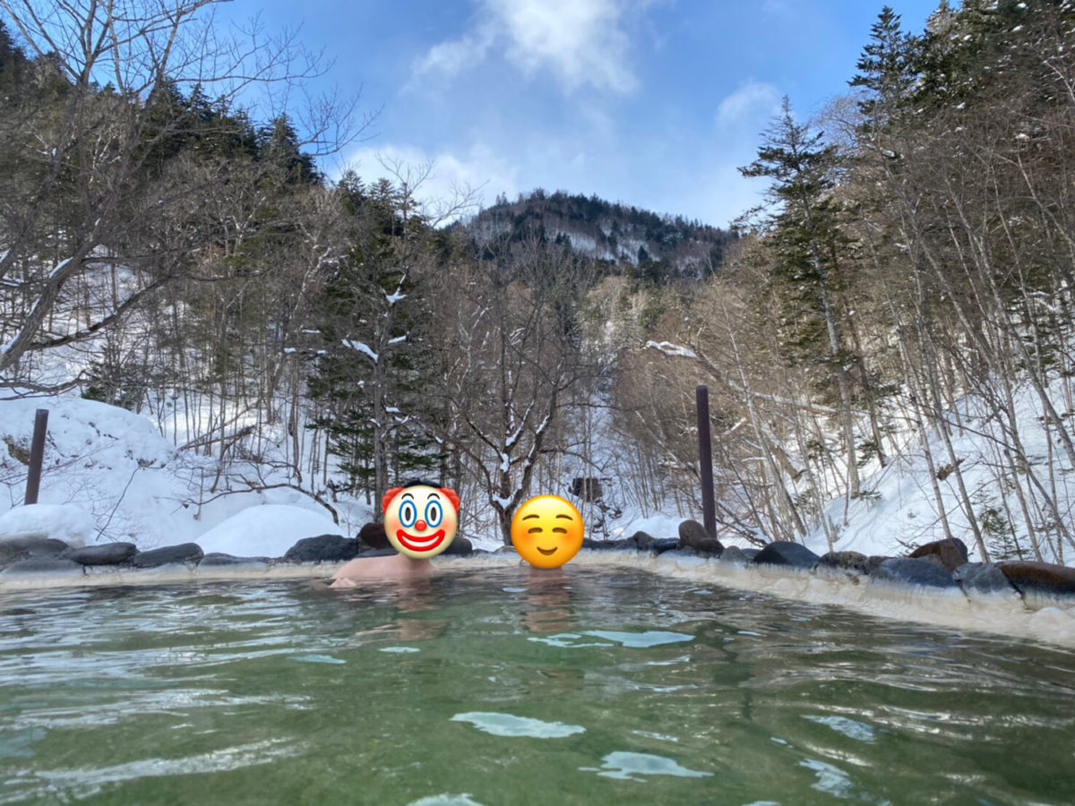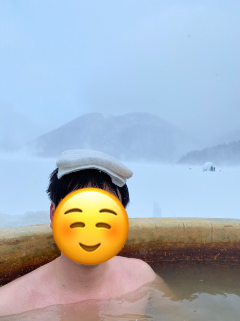 まだ見ぬ温泉への期待というより足元の冷たさに急かされ、一心不乱に服を脱ぎました。冷気が体幹をさらいます。脱衣所からお風呂までは、10秒程度ですが、地面に触れている足は冷たさを通り越し、痛いです。露天へつながる数段の階段をのぼると眼前に真っ白な世界が広がります。景色を楽しむのは束の間、-5℃の風が吹き抜け、身震いするまもなくお風呂に飛び込みました。