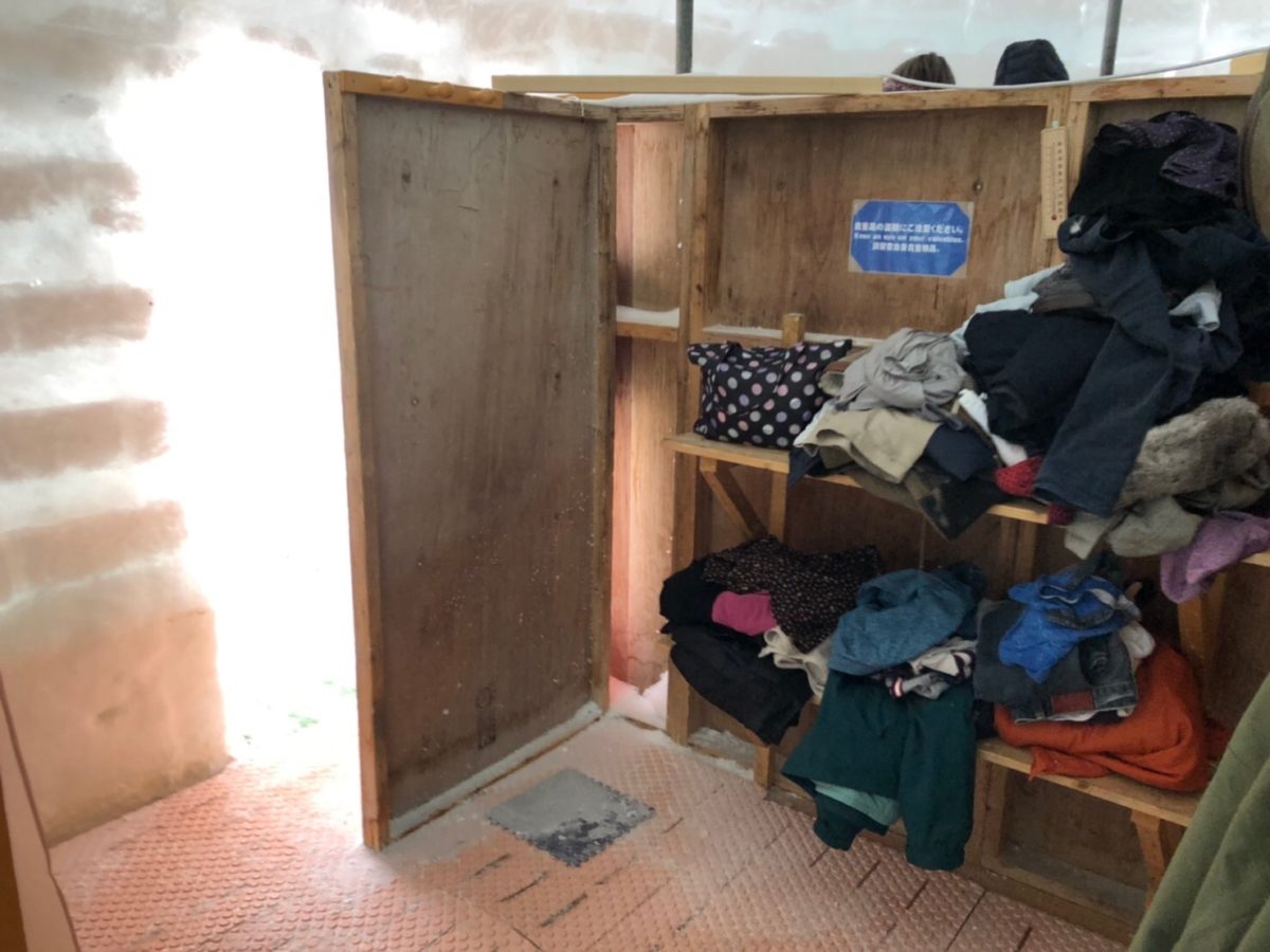 入り口で靴を脱ぎます。脱衣所にはマットが引いてありますが、凍っているため靴下が濡れてしまいます。靴下の替えは必ずもって行きましょう!