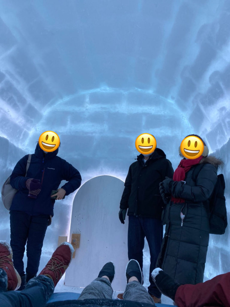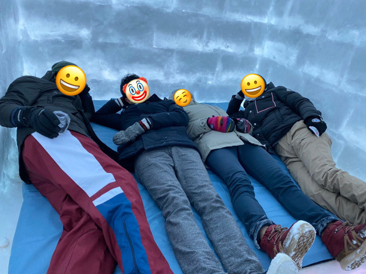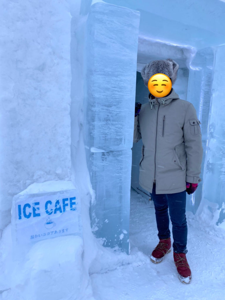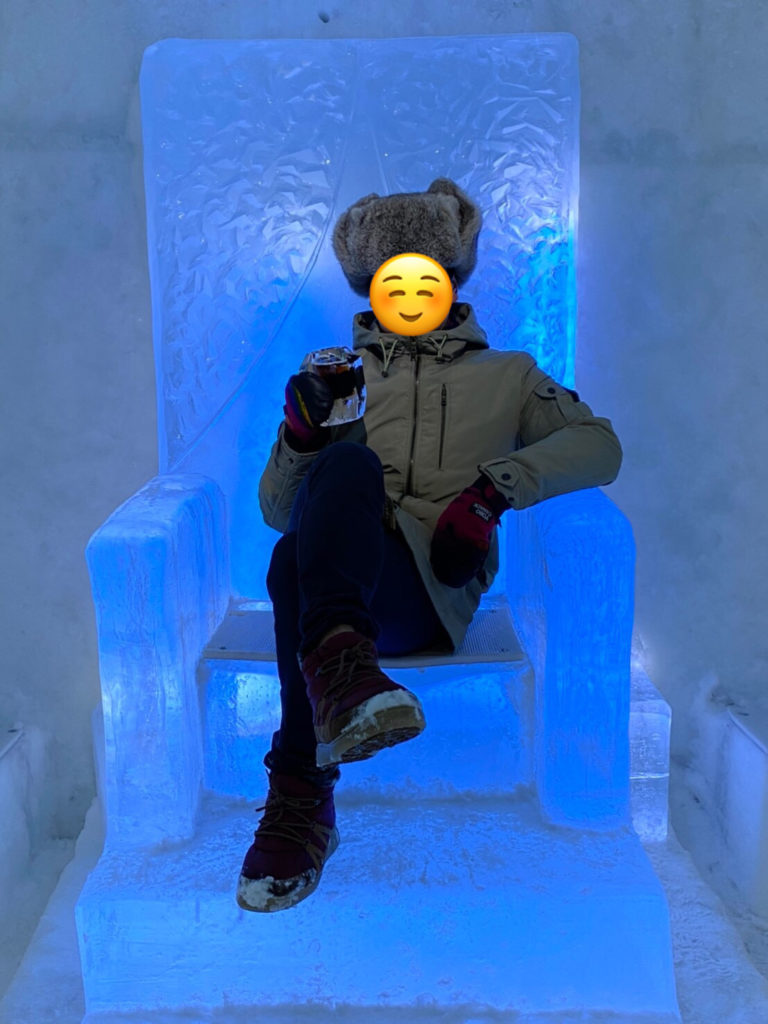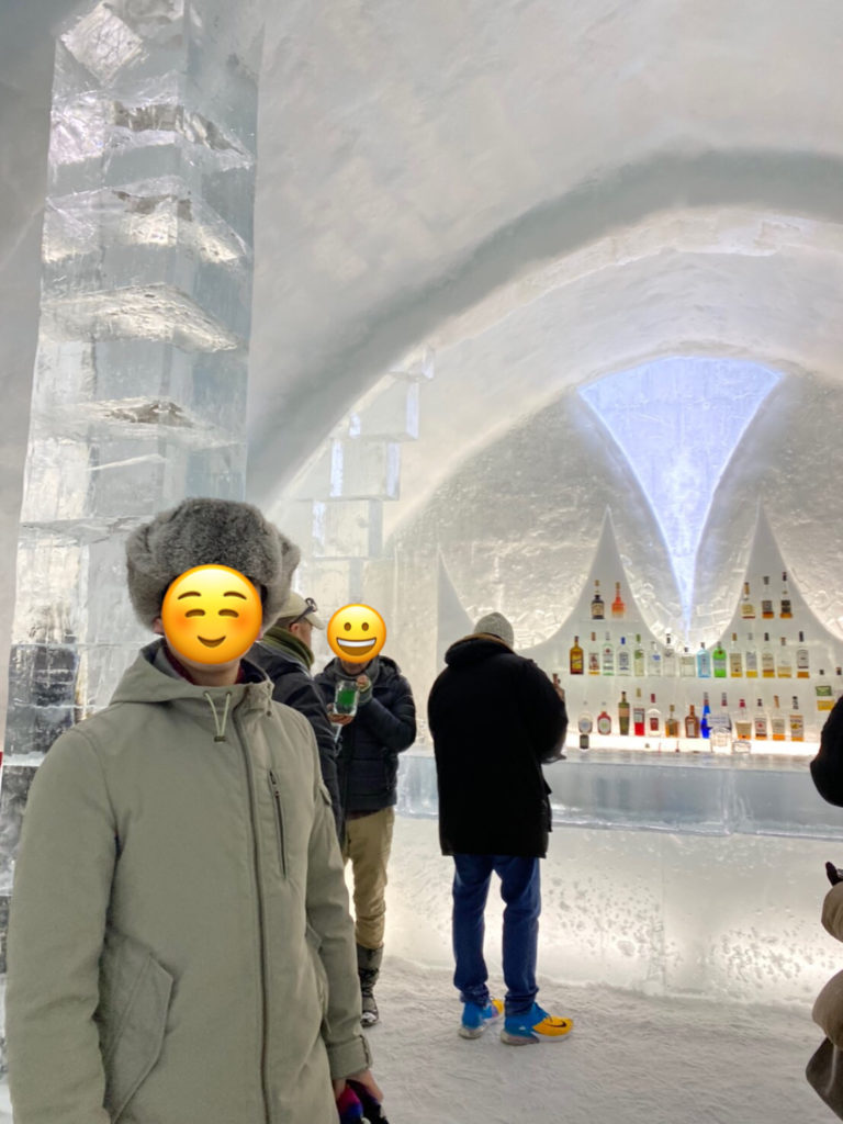 そして最後に、気になっていたアイスバーに行きました。ここは一際大きな作りになっており、一歩足を踏み入れるとほんのりと温かく、外の吹雪の世界とは違い安心感のある居心地の良い場所でした。