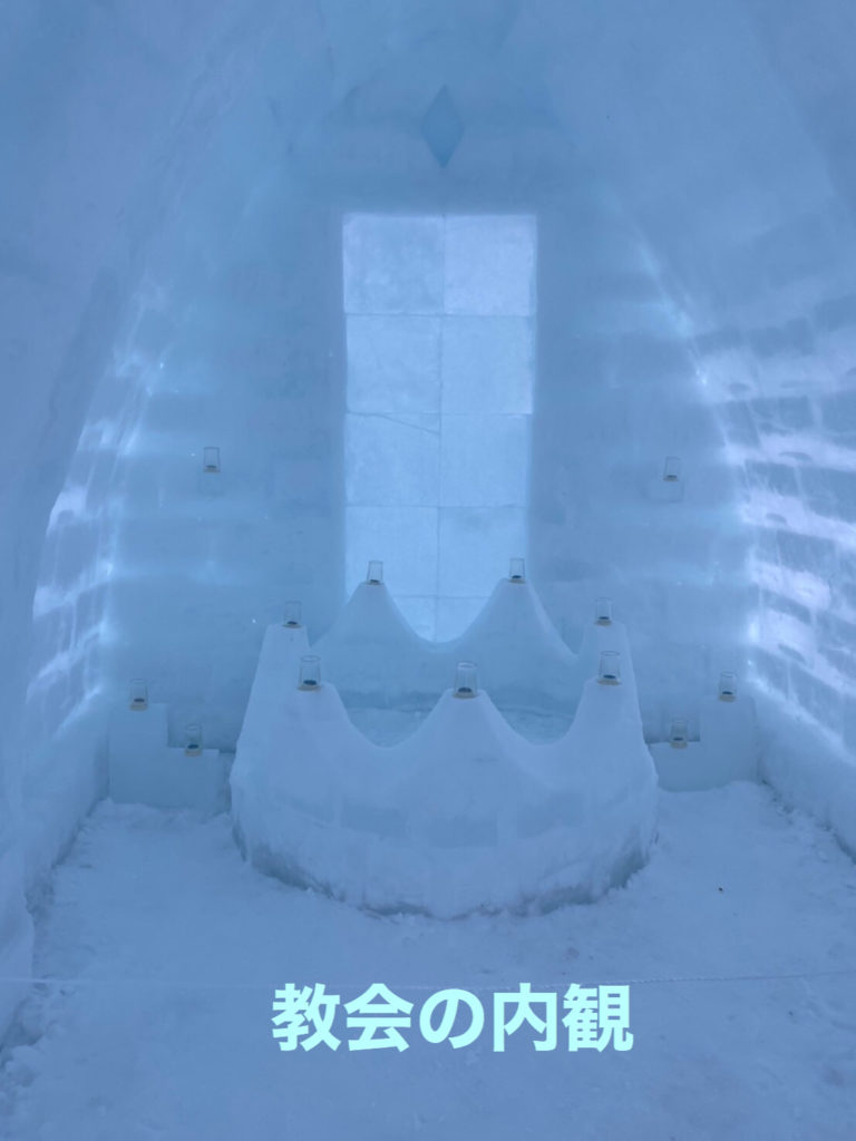 体をしっかりと温めた後は、会場内を散策しました。会場内には教会(実際に挙式できる)や、氷でできたかまくらのようなもの(イグルー)、コンサートホールがありました。