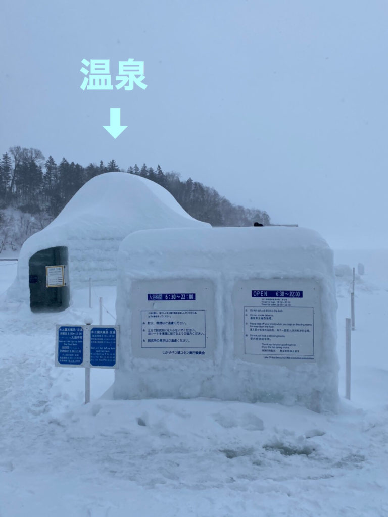 さて、お湯加減は?外の寒さとは正反対にとても温かく最高のお湯です。温泉は湖畔の「然別湖畔温泉ホテル 風水」からひいている源泉かけ流しの贅沢なものです。浴槽は一つですが、10人くらいは入れる広々としたものでした。体を芯から温めるには、体が芯から冷えていることが大切であることを初めて知りました。温まってくるにつれ、周囲の景色を楽しめるようになりました。一面の銀世界!氷結した湖上を風が音をたて吹き抜け、顔にあたります。濡れた後ろ髪はすっかり凍ってしまいました。試みに浴槽から立ってみましたが、モグラ叩きのモグラのように一瞬で湯船に戻りました。ただの露天風呂にあらず。