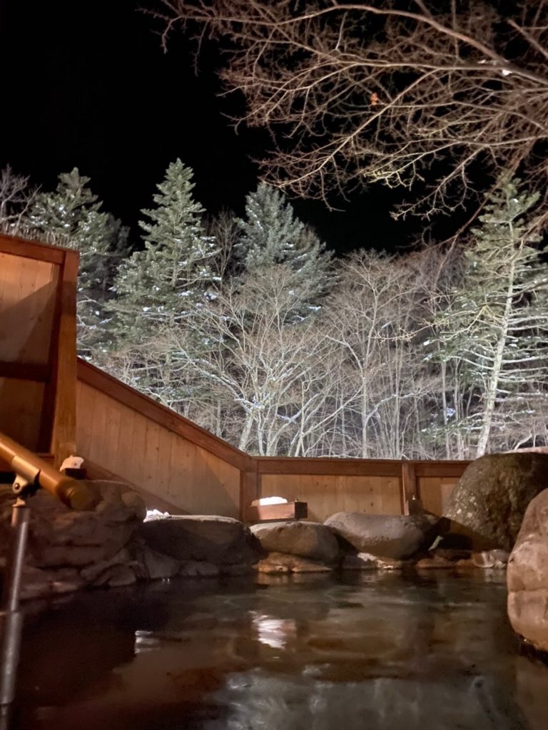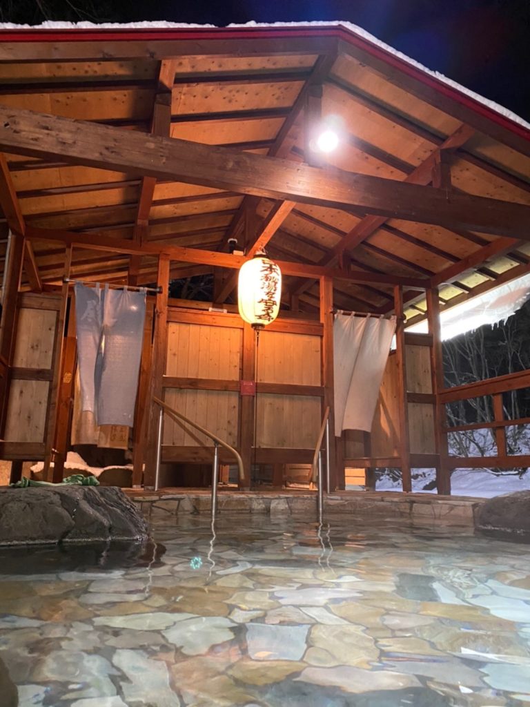続いて「ぬかびら源泉郷の湯元館」に行きました。ぬかびら源泉郷は、昨年2019年に開湯100年を迎えた歴史ある温泉街です。その中でも開湯者の開いた湯元館は由緒ある温泉で、内湯と檜湯、露天の3つがあり、静寂の中お湯の流れる音だけが響く風流な温泉でした。