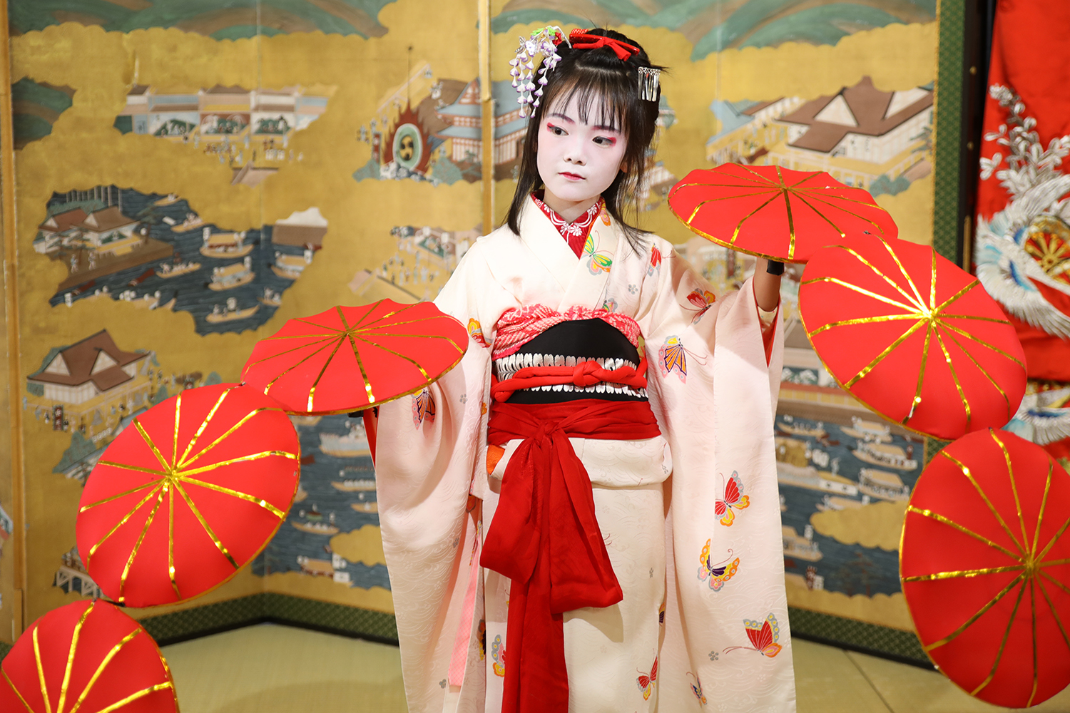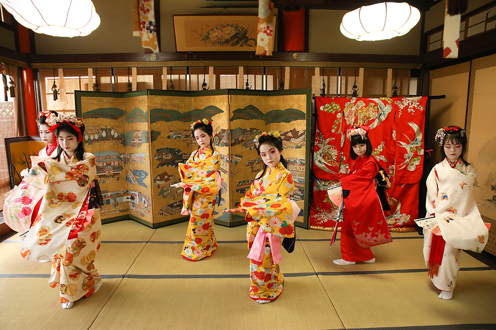 島原を盛り立てようと末廣屋は「基礎はきっちりと、太夫になるには心が大切」と舞をはじめとした諸芸の練習はもちろん、禿のときから舞台や音楽、美術に触れる機会ができるようにと努めています。