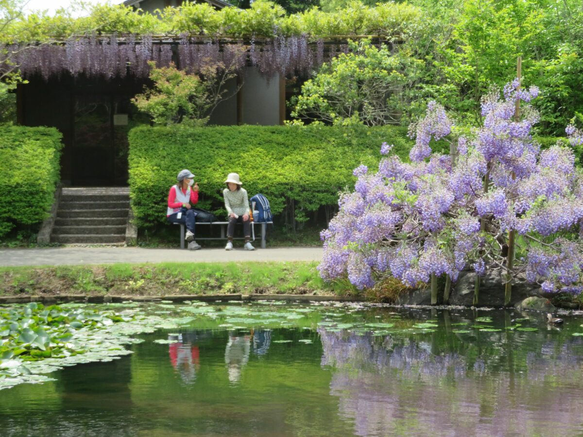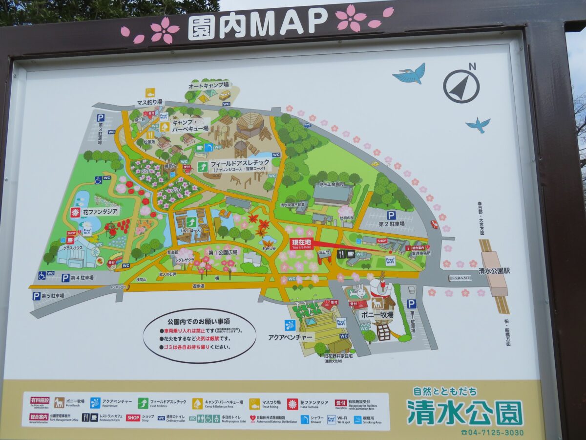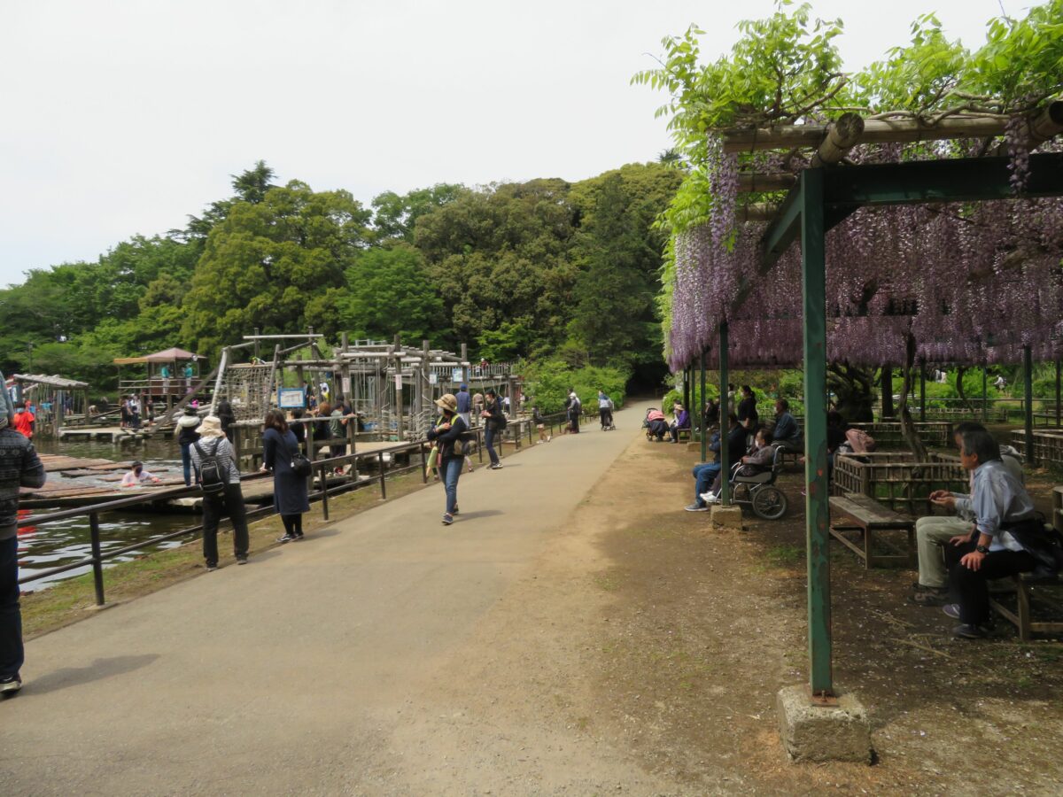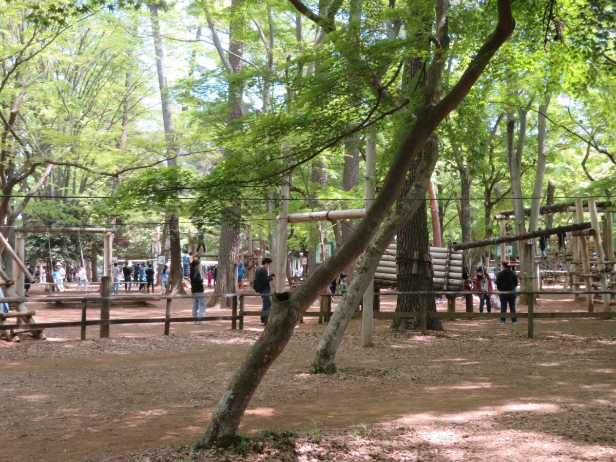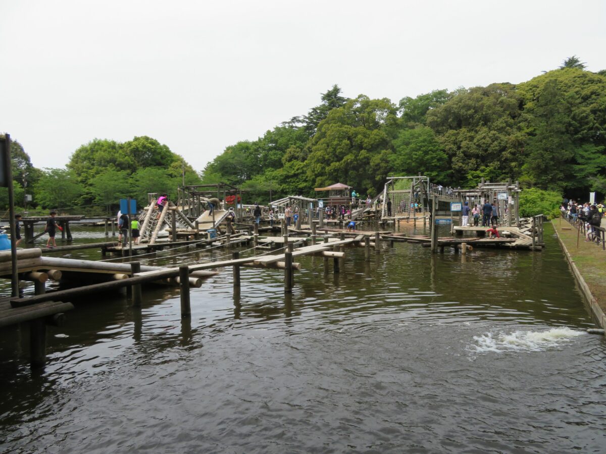 せせらぎに沿って東に歩くとフィールド・アスレチックのエリアに繋がります。敷地内には、チャレンジコース、冒険コース、水上コースに分かれ、清水公園では最も人気のあるエリアとなっています。水上コースの東には藤棚が設けられ、つつじとほぼ同じ時期に花を咲かせます。