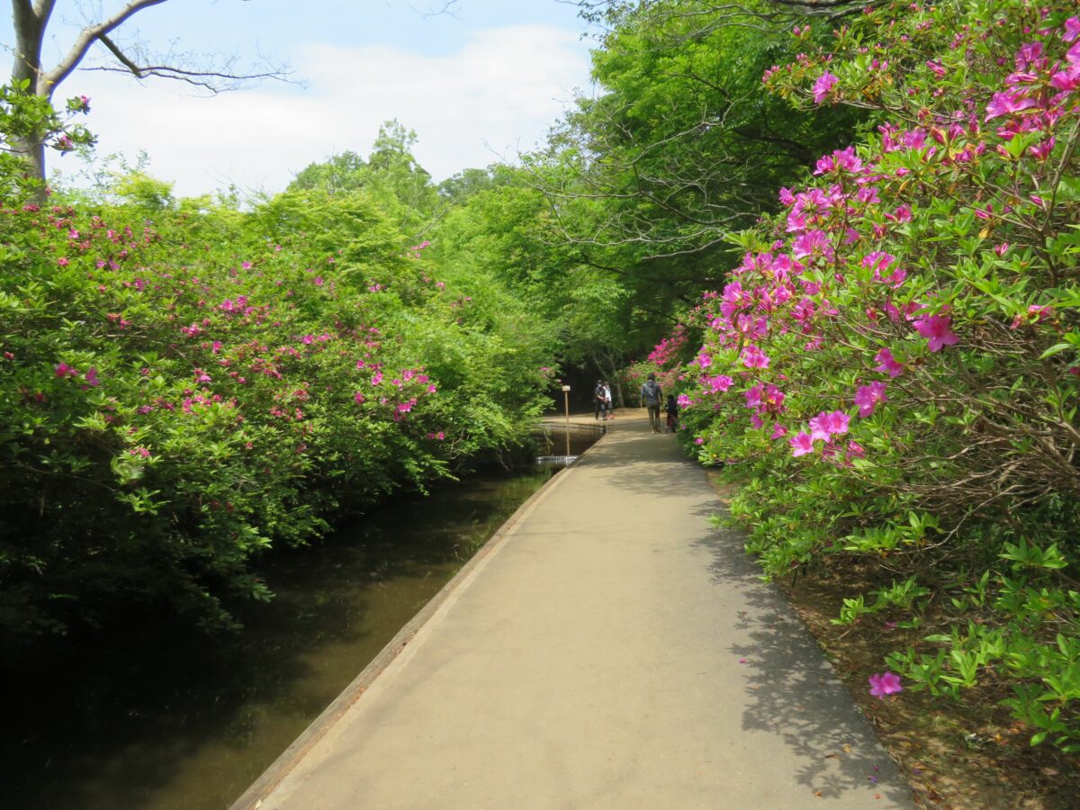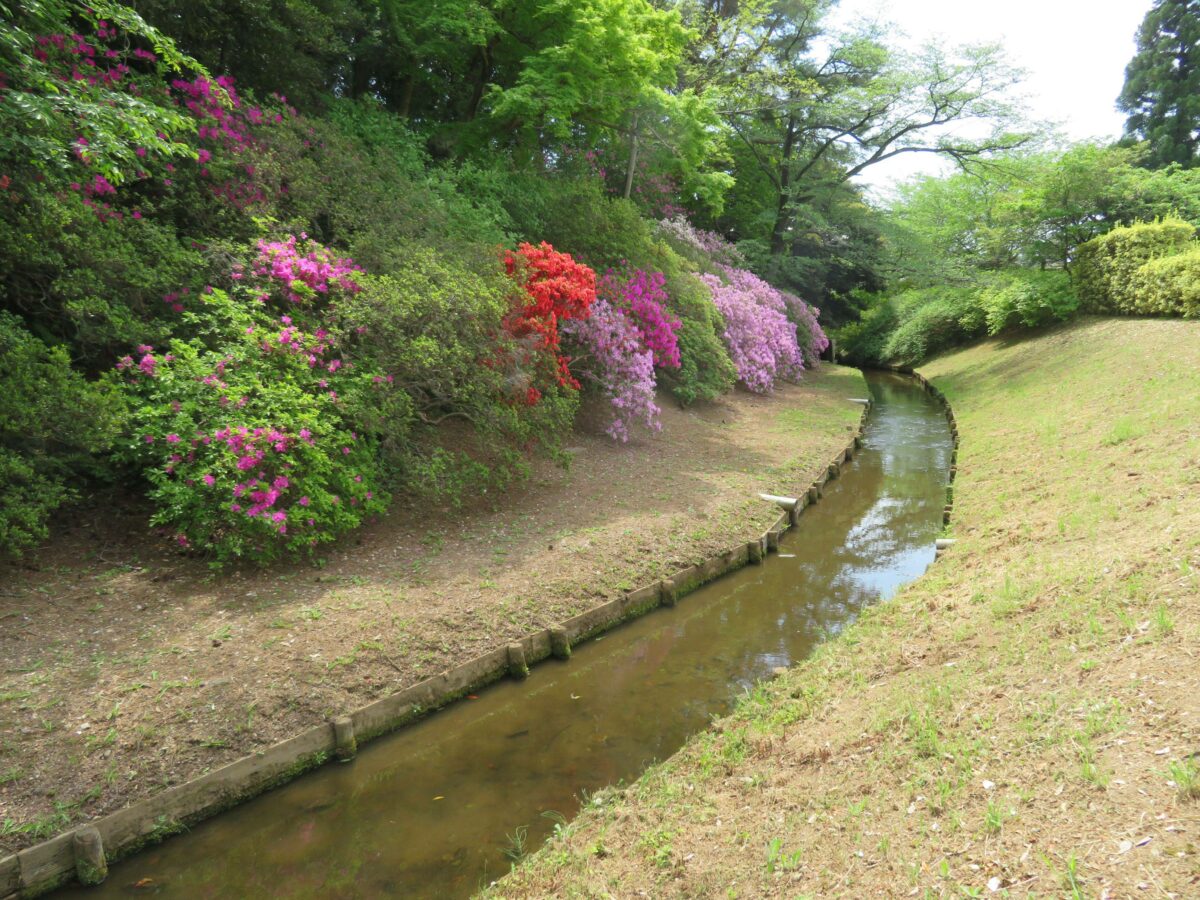 つつじの群生エリアの南西にはせせらぎが流れ、つつじの花に異なる情緒を添えてくれます。