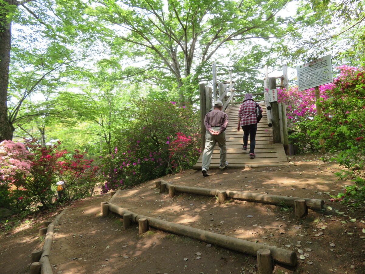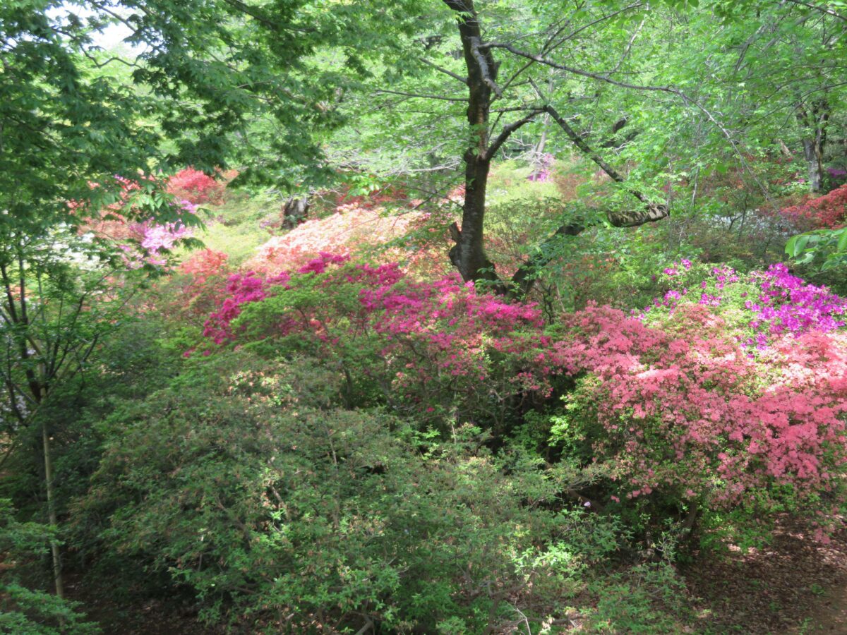 つつじの群生エリアには、樹齢300年を超える「キリシマツツジ」をはじめ「オオムラサキ」、「オオヤマツツジ」、「ハナグルマ」、「リュウキュウ」、「ミネノマツカゼ」、「ヤマツツジ」など100種類前後のつつじが、品種ごとに異なる色や形の花を咲かせます。群生エリアには展望台が設置され、豊かな彩りのつつじの花が波を打っているかのようです。