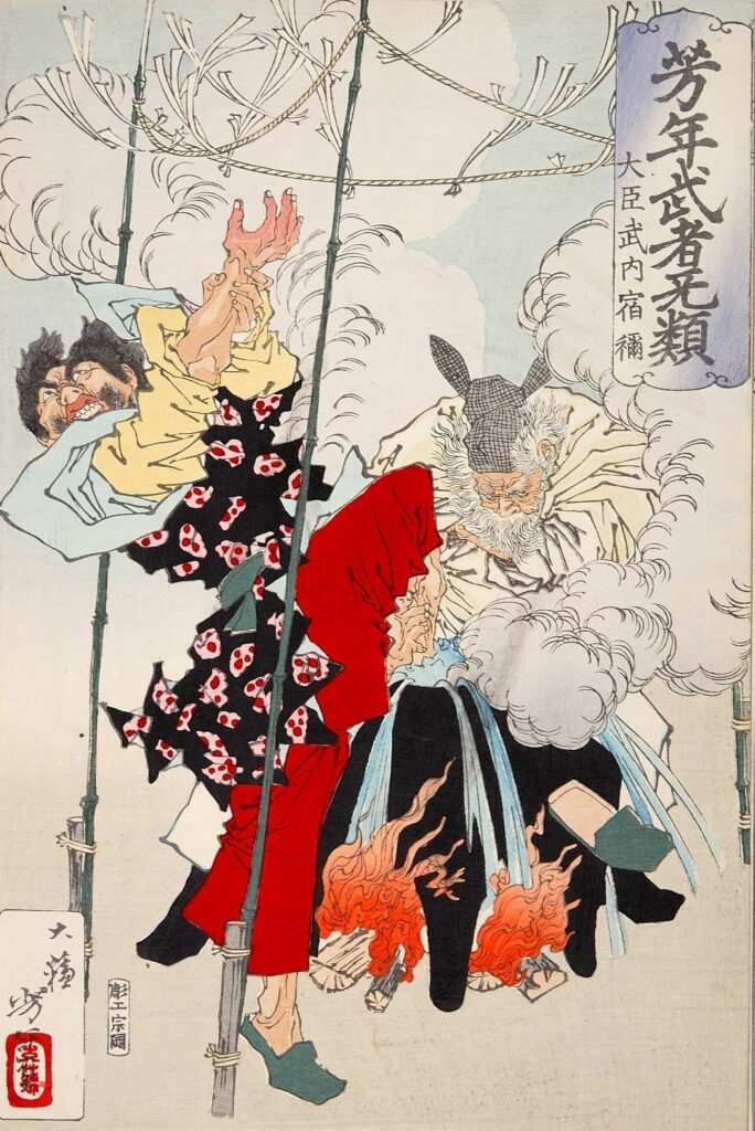 大和朝廷初期の大臣、武内宿祢(たけしうちのすくね)は異母弟から謀反の疑いをかけられ、盟神探湯で濡れ衣を晴らしたとされる/月岡芳年・画