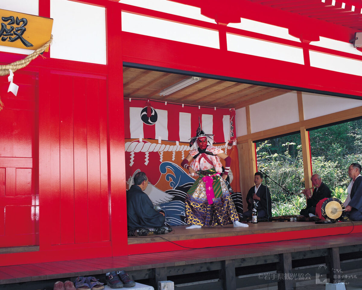 岩手県「鵜鳥神楽」。様々な舞とともに、鵜鳥神社の神霊を移した獅子頭を奉じる舞を行う山伏神楽の一例