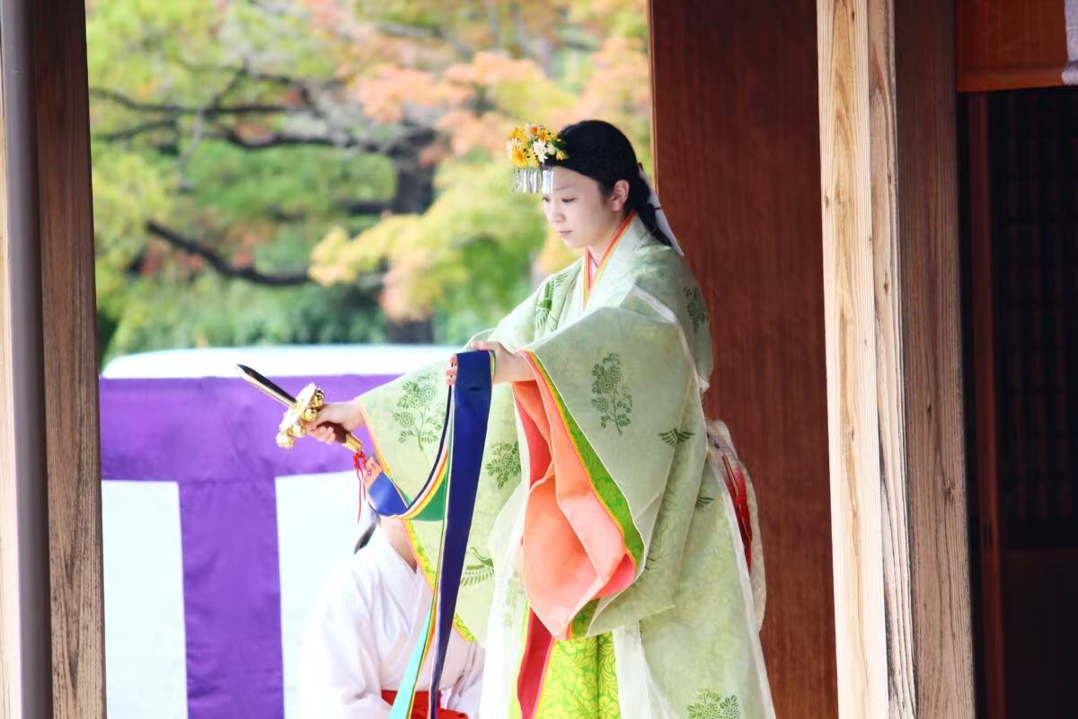 その後、春日大社の富田光美氏らの努力によって復興された巫女神楽は、呪術性が薄れ、芸術性が高く洗練されたものへと変化を遂げます。神をもてなすために神歌とともに優美に舞う八乙女(やおとめ)といわれる舞がありますが、現在、神社などで舞われる巫女舞の多くは八乙女の舞です。